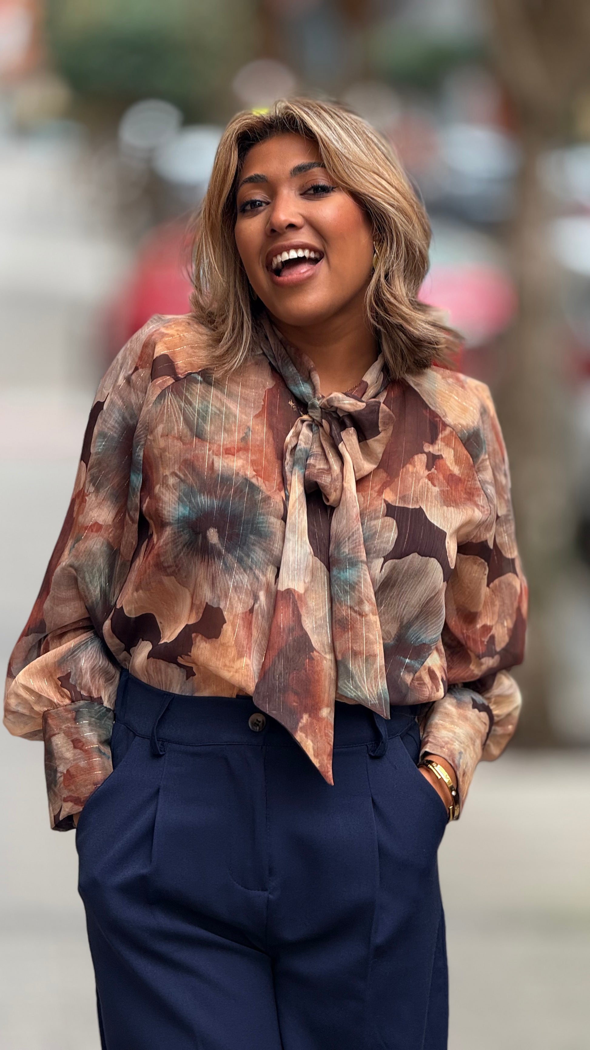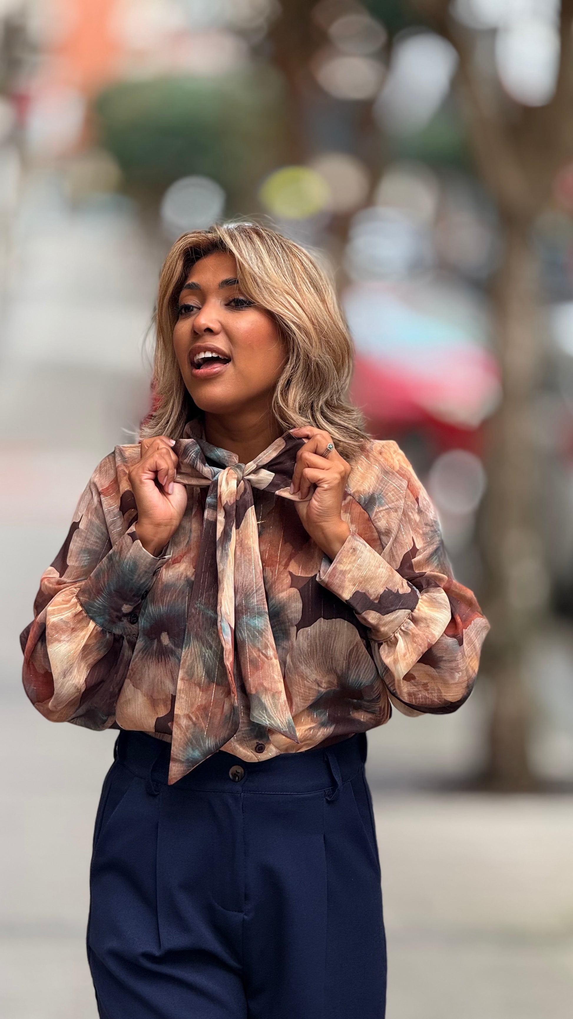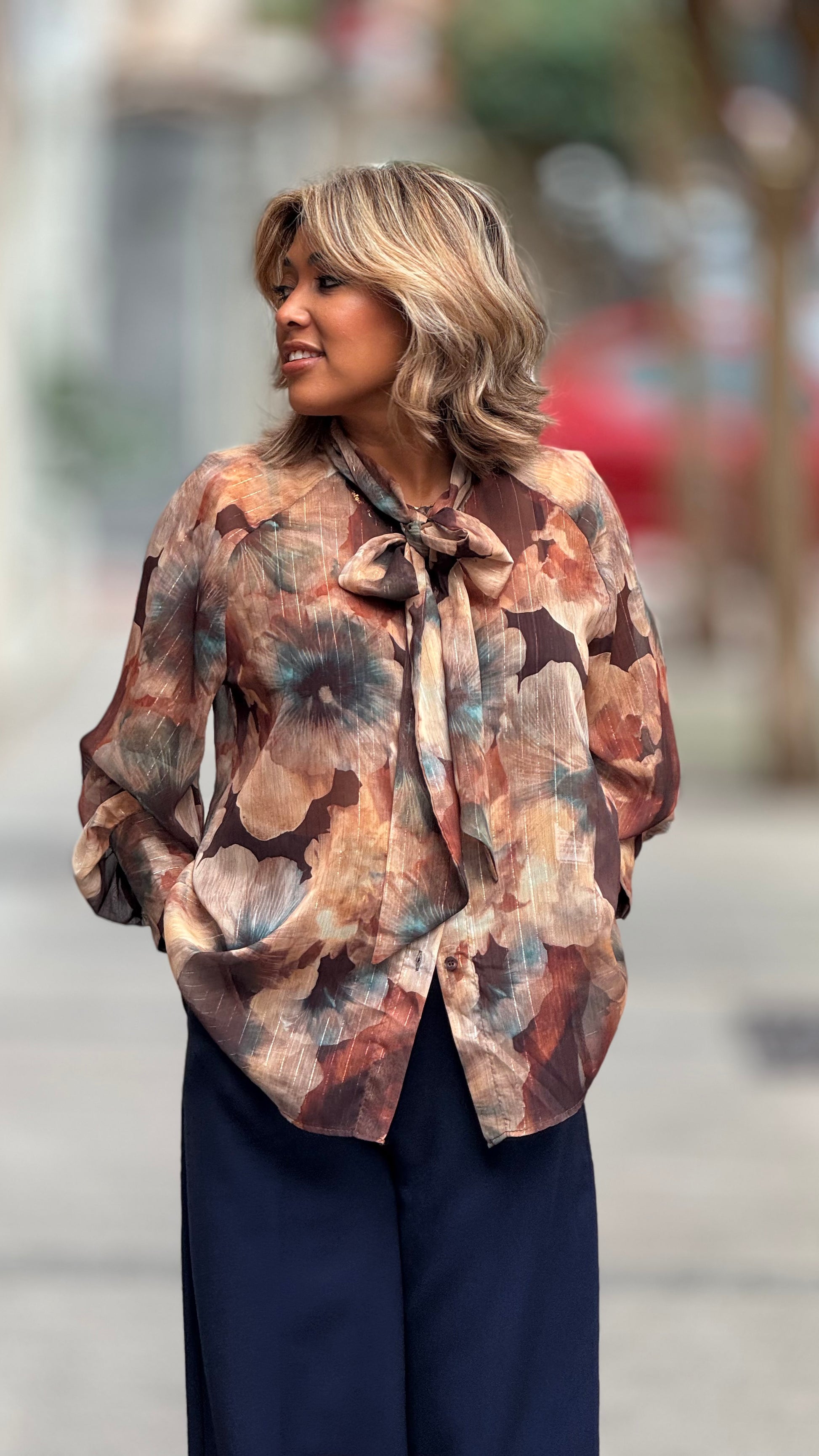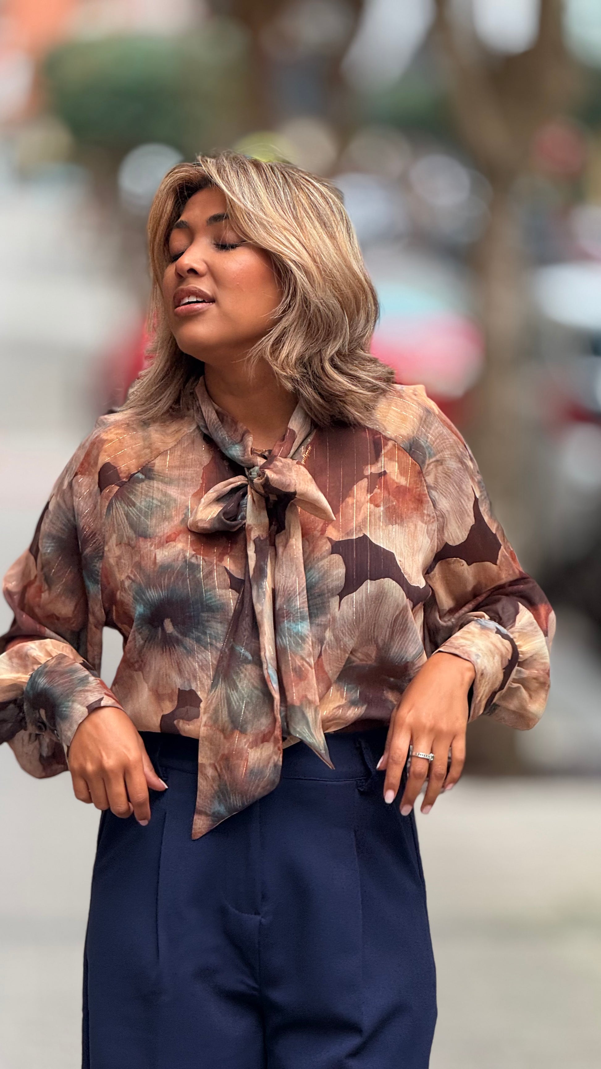 Esta blusa con lazada y estampado en tonos tierra es la elección perfecta para un look elegante y moderno. La lazada le da un toque único y femenino, mientras que el estampado en tonos tierra la hace versátil y fácil de combinar.