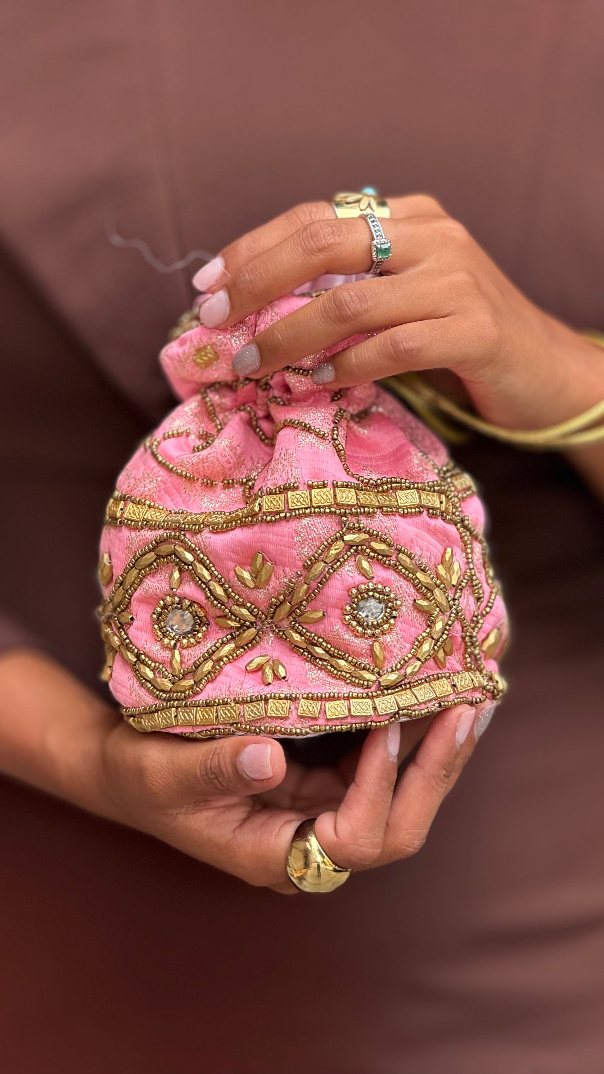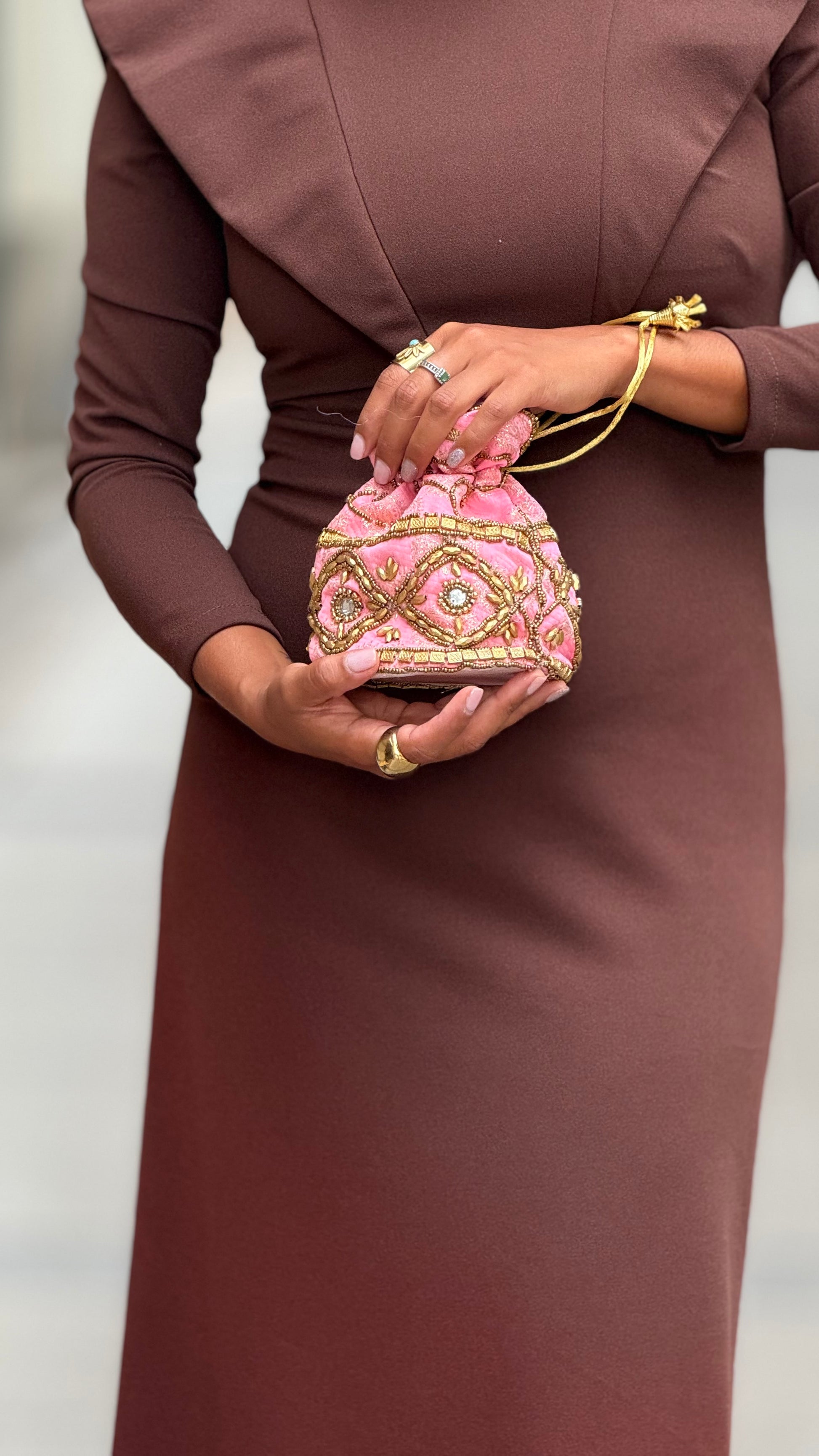 Bolso en tela satinada con detalla de piedras y abalorios dorados por todo el bolso