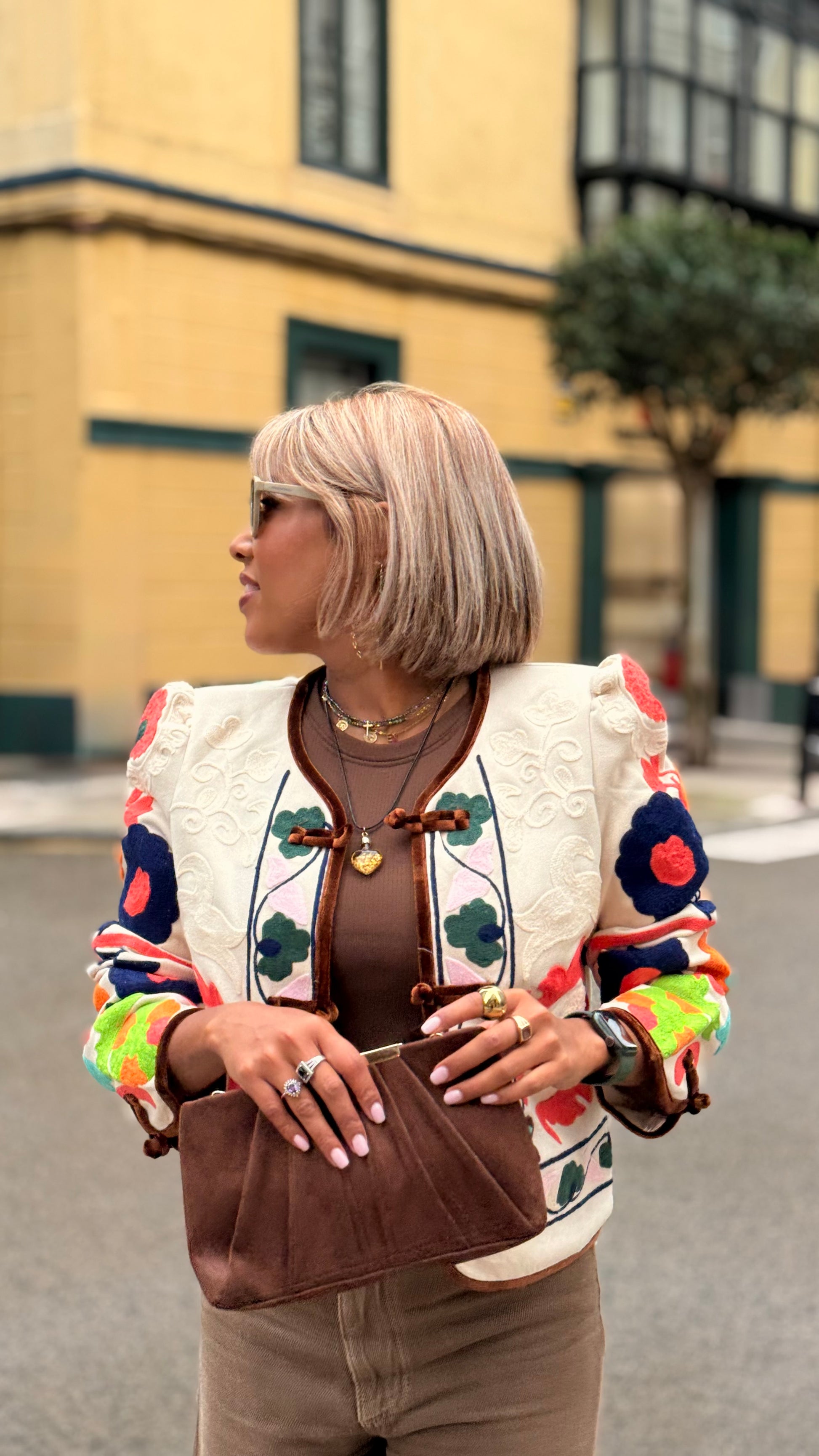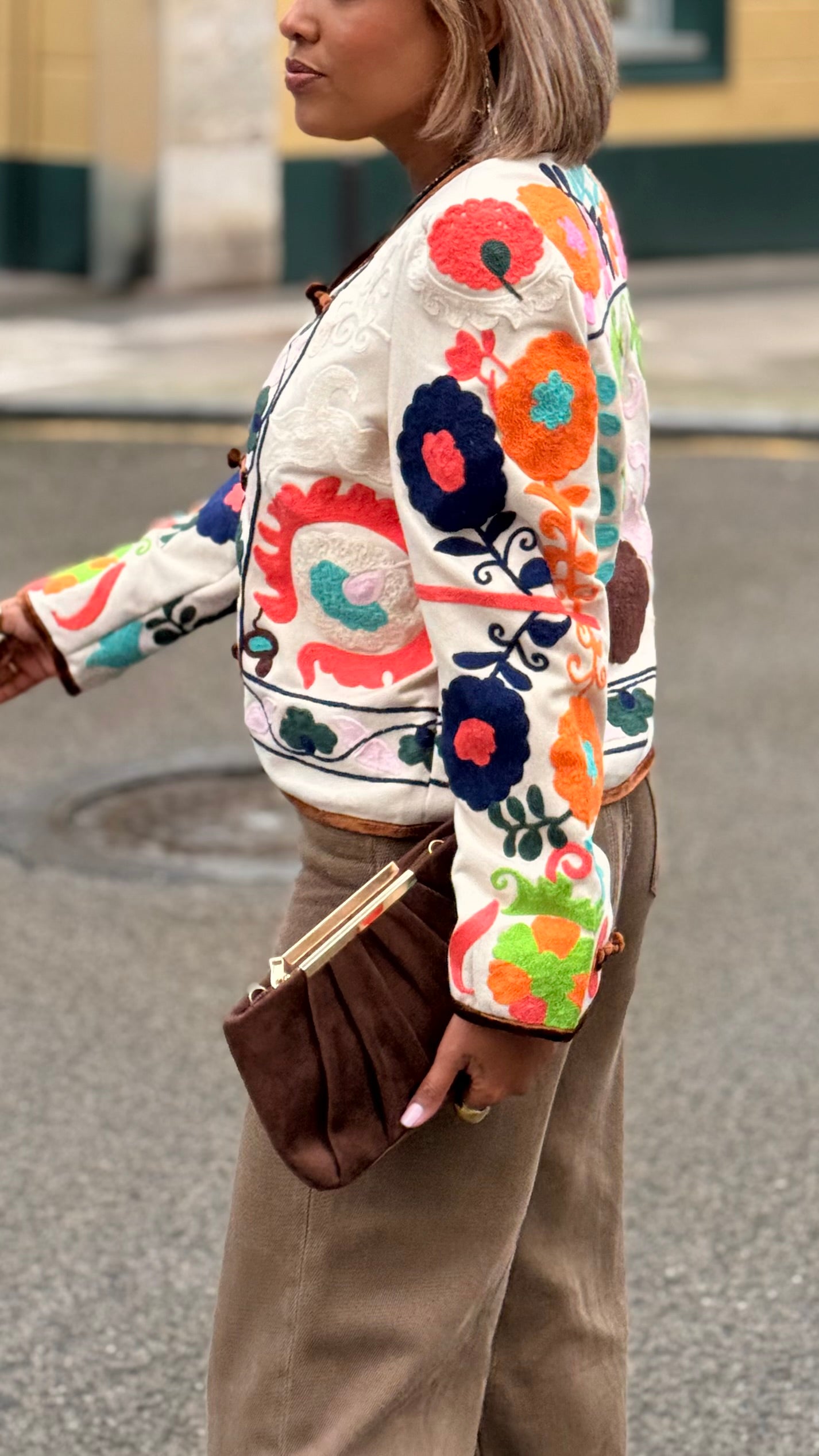 Una pieza especial que transforma cualquier look en segundos. Esta chaqueta corta en tono crudo destaca por su espectacular bordado multicolor de inspiración artesanal, con detalles florales y acabados en contraste que la convierten en una prenda única y con muchísima personalidad.