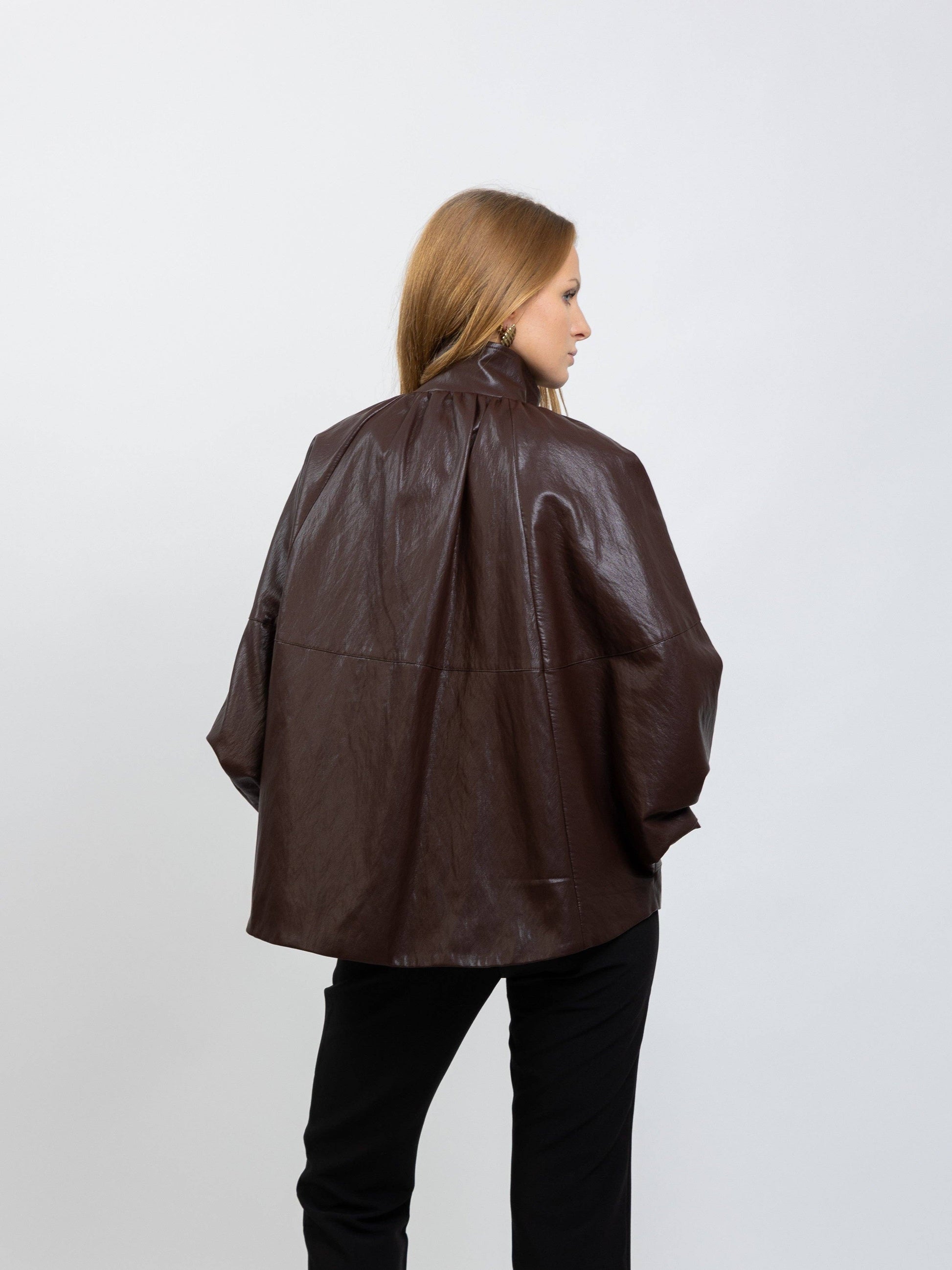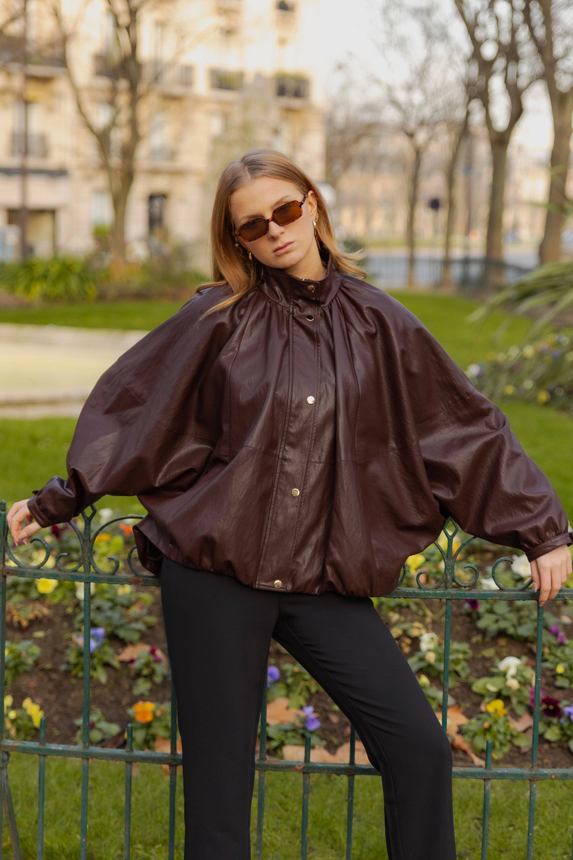 Imprescindible y audaz, esta chaqueta capa de cuero sintético es la pieza central para aquellas que aman destacar. Su corte de murciélago crea un volumen espectacular. El contraste del cuero sintético y los accesorios metálicos dorados aportan una dimensión lujosa a tu atuendo. Ya sea para una noche o para realzar un look urbano, esta chaqueta impone su carácter. - Cuello alto - Cierre frontal con cremallera metálica oculta bajo solapa con botones a presión - Mangas con puño cerrado por un botón a presión - Bolsillos en la parte delantera