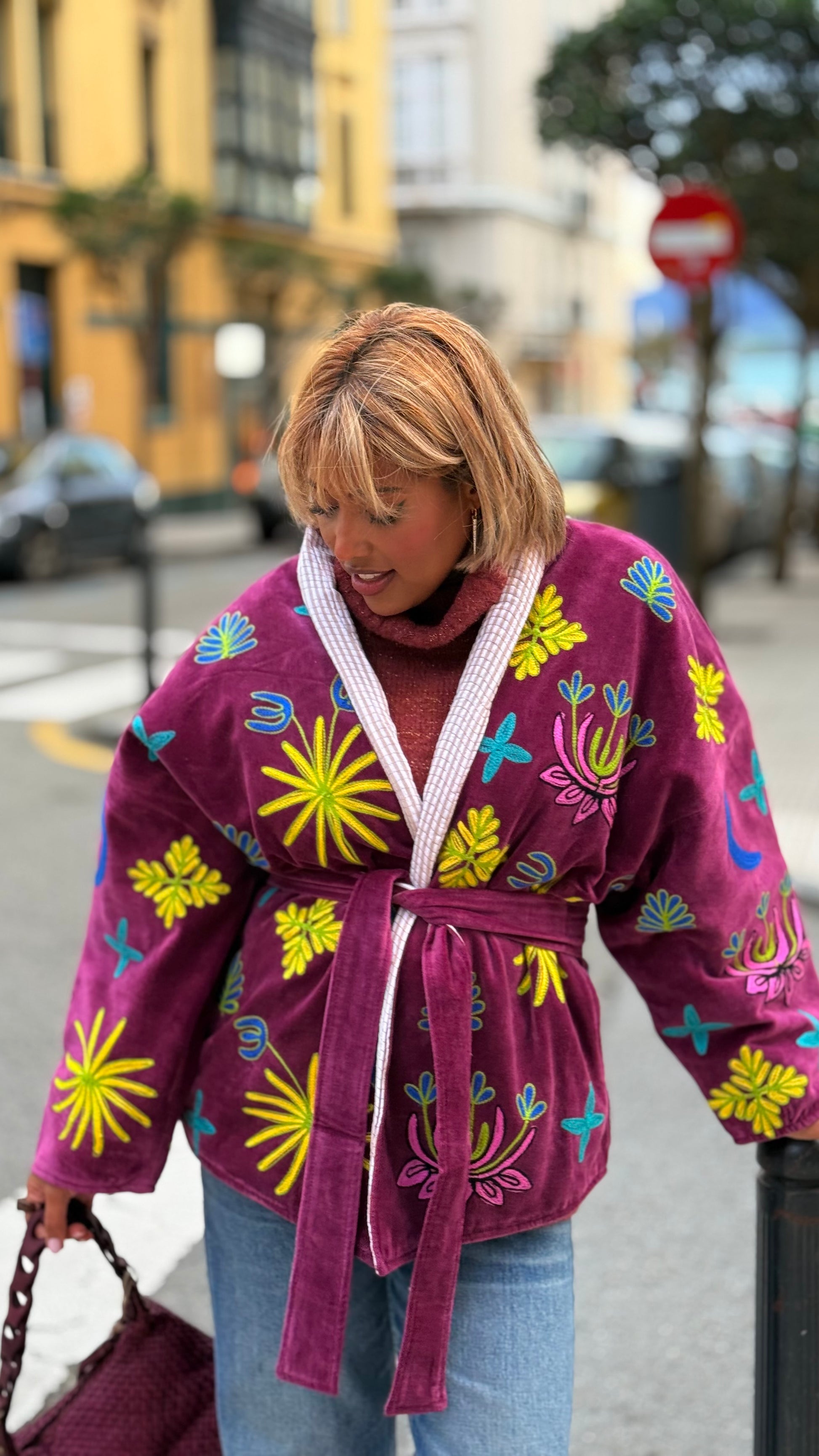 DESCRIPCIÓN Esta chaqueta de terciopelo es una pieza que seguramente llamará la atención. El suave y lujoso terciopelo está adornado con coloridos bordados que representan patrones florales, lunas crecientes y leopardos estilizados. Los colores brillantes y los detalles intrincados crean un contraste llamativo con el fondo burdeos, otorgando a la chaqueta un encanto bohemio y artístico. El corte suelto y relajado de la chaqueta la hace cómoda de llevar y fácil de combinar con diferentes conjuntos. Llévala con jeans y una camiseta para un look casual, o con un vestido elegante para una ocasión especial.