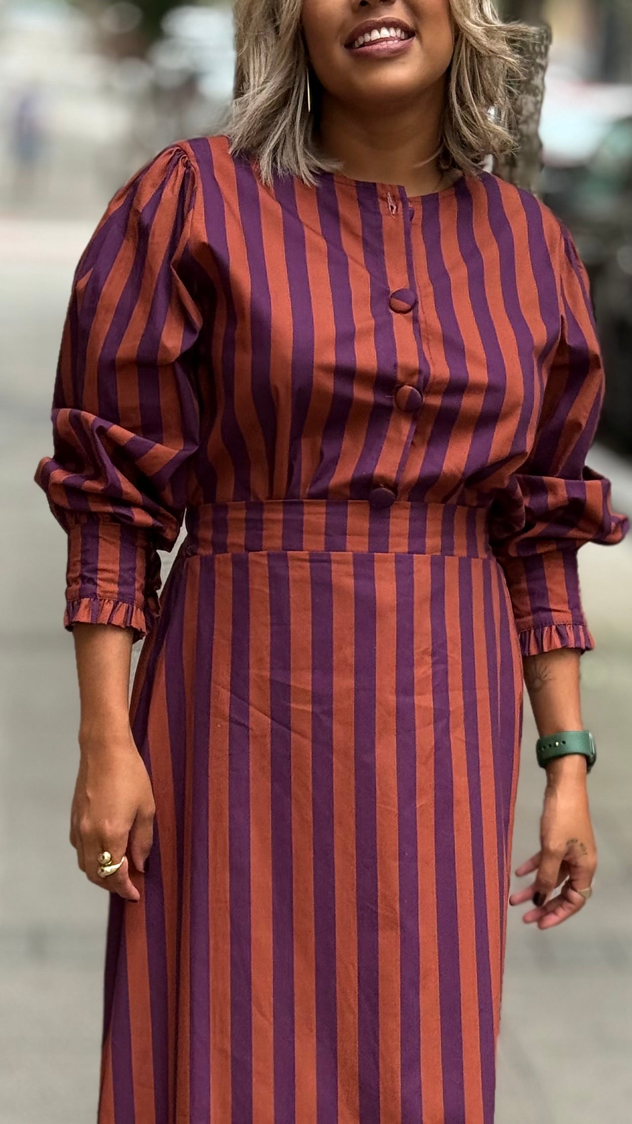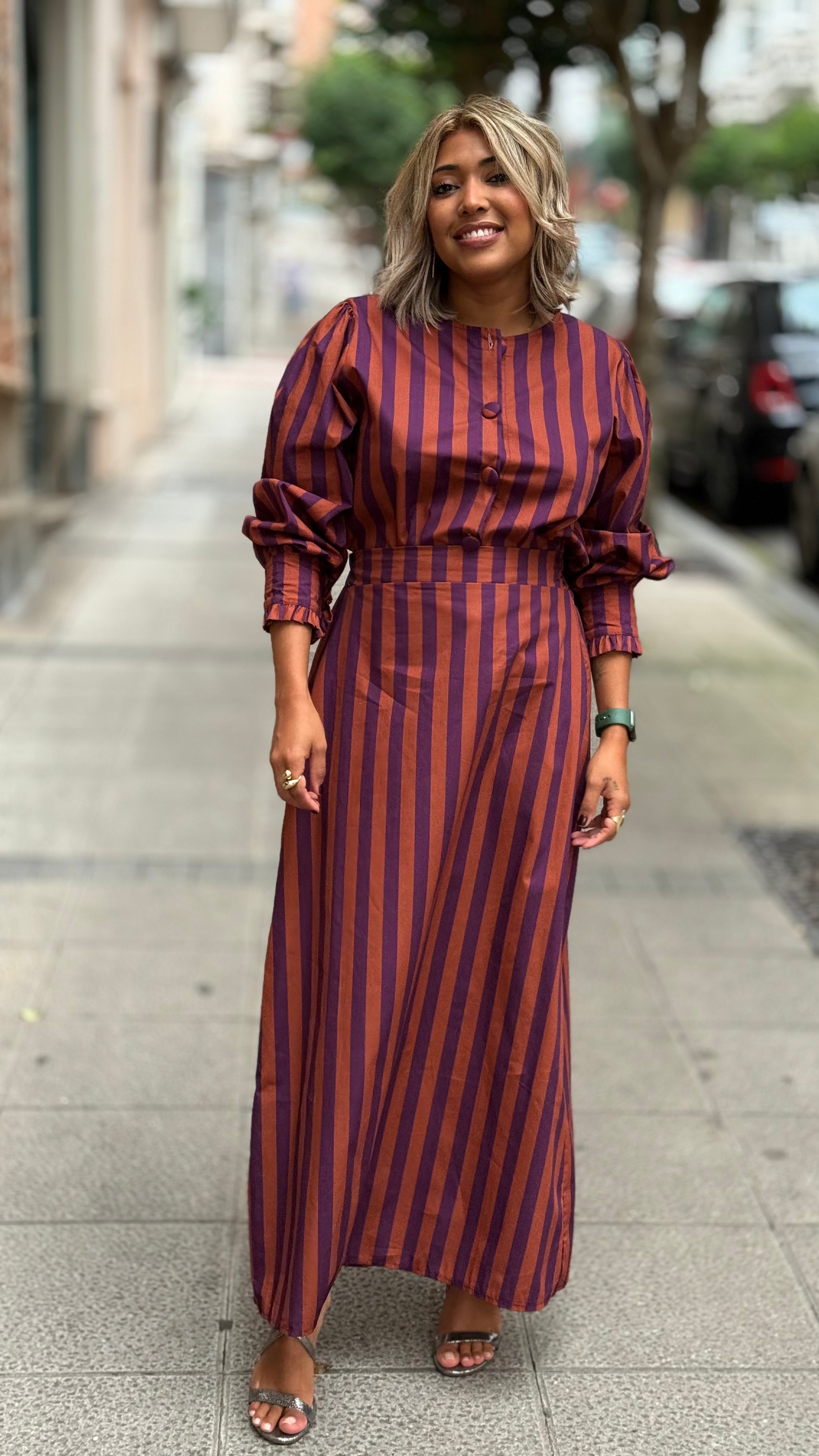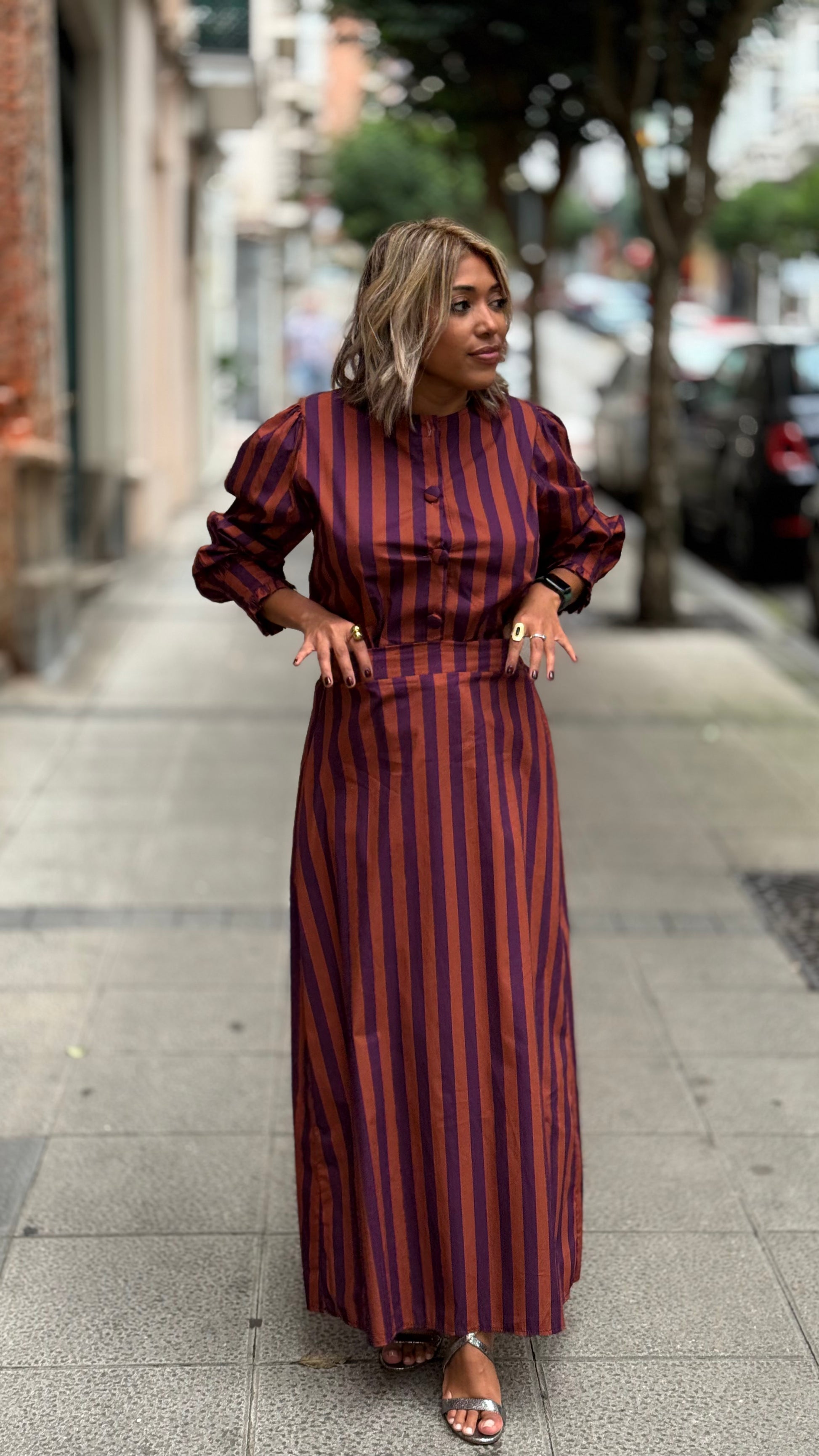 Conjunto en algodón 100a% compuesta por blusa de manga larga y falda en estampado de líneas en tonos morado y naranja