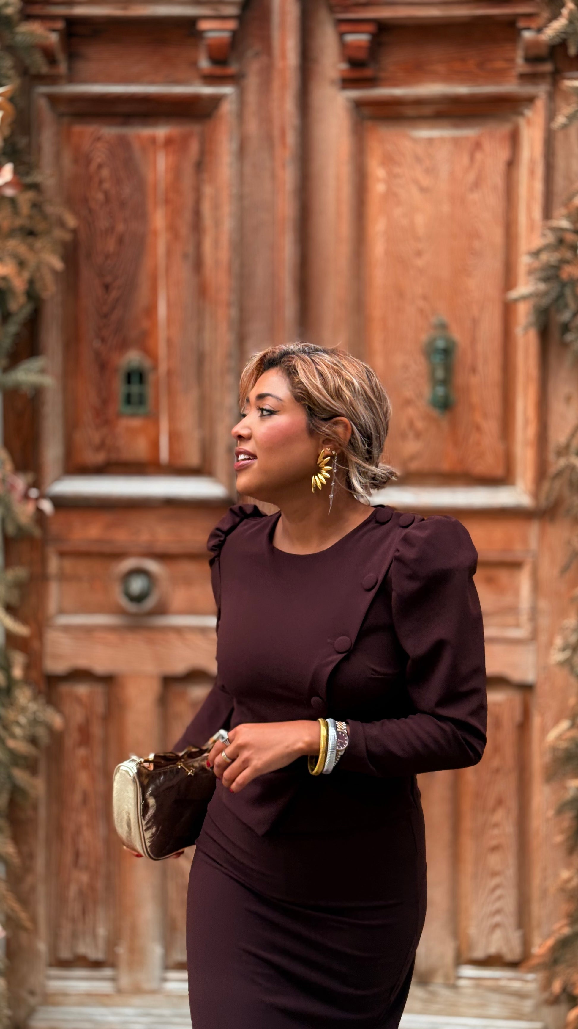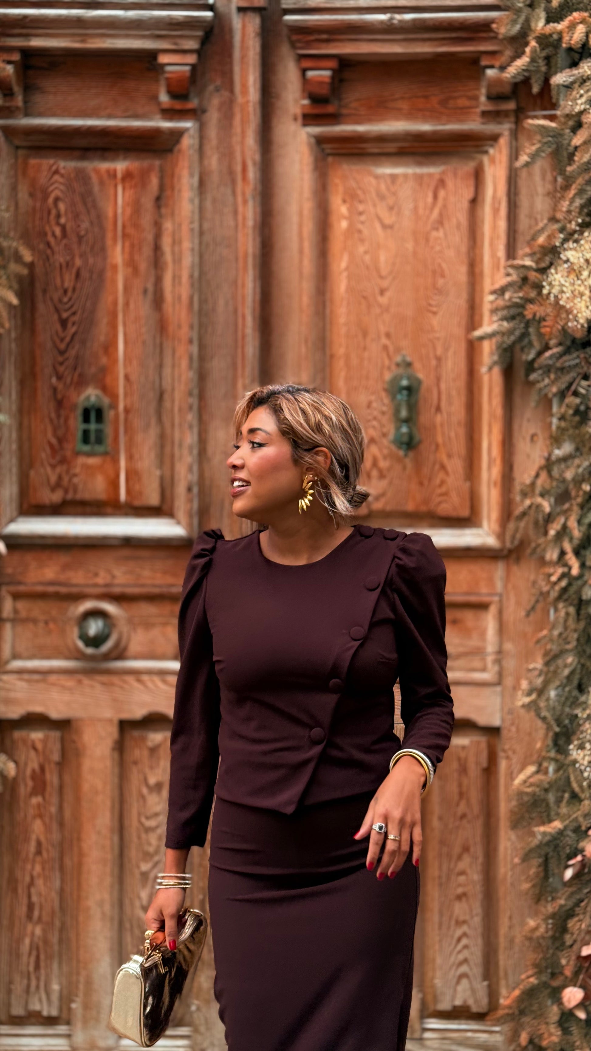 ElConjunto Aperol es un conjunto liso marrón que incluye un top con mangas abullonadas y una botonadura en diagonal, complementado con una falda entubada. Su diseño versátil y elegante se adapta a diversas ocasiones, ofreciendo confort y estilo en una talla única.