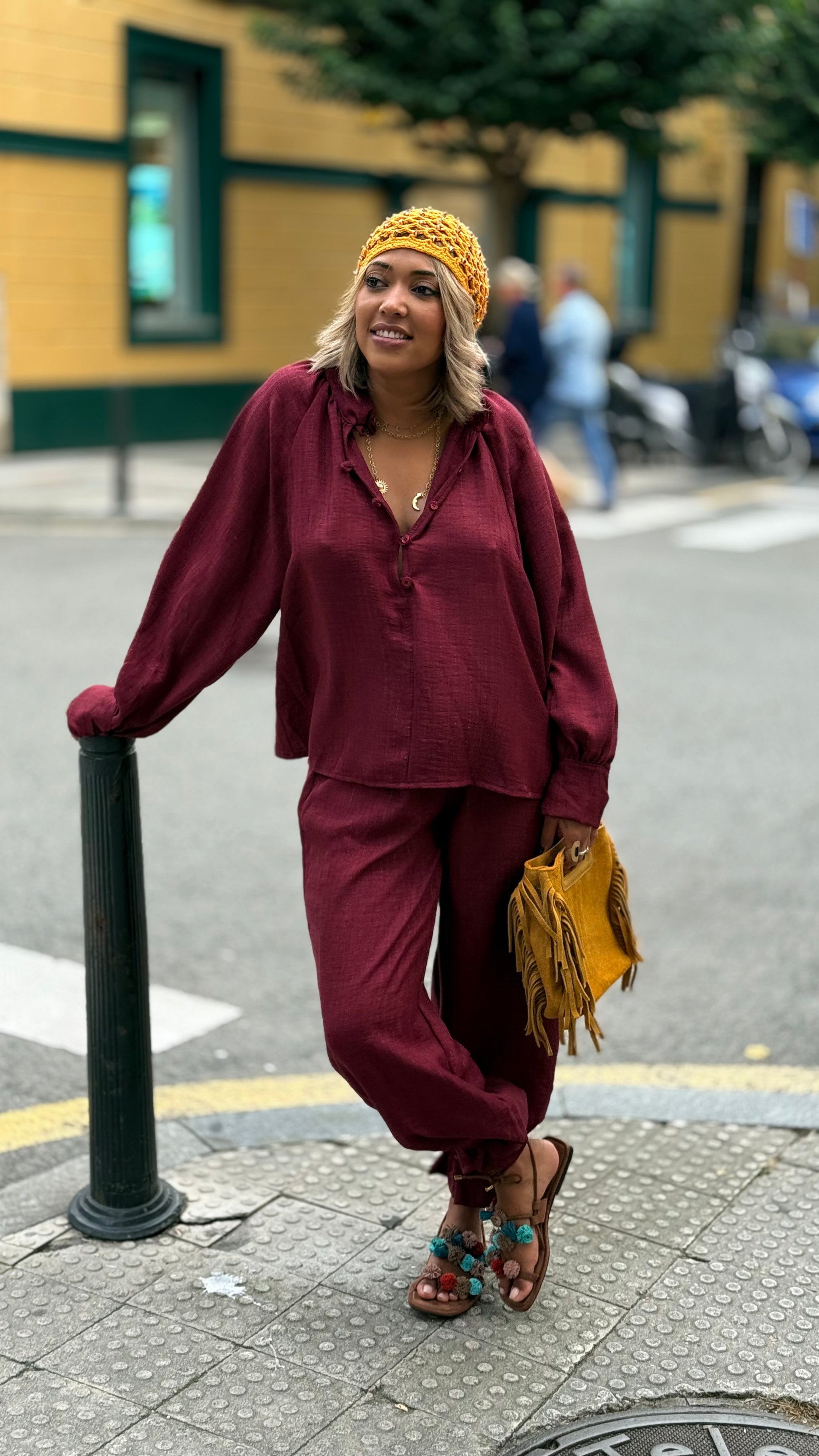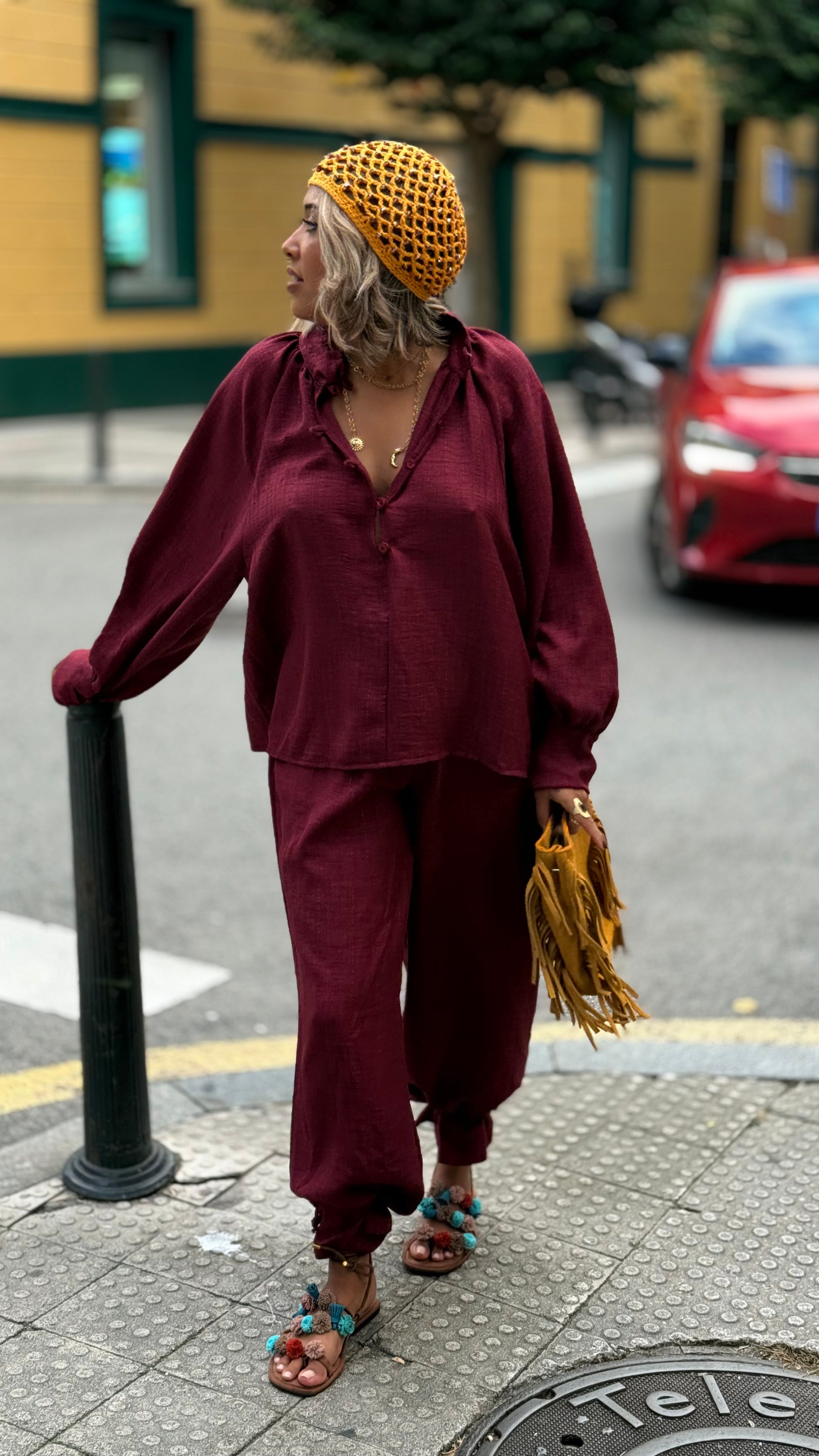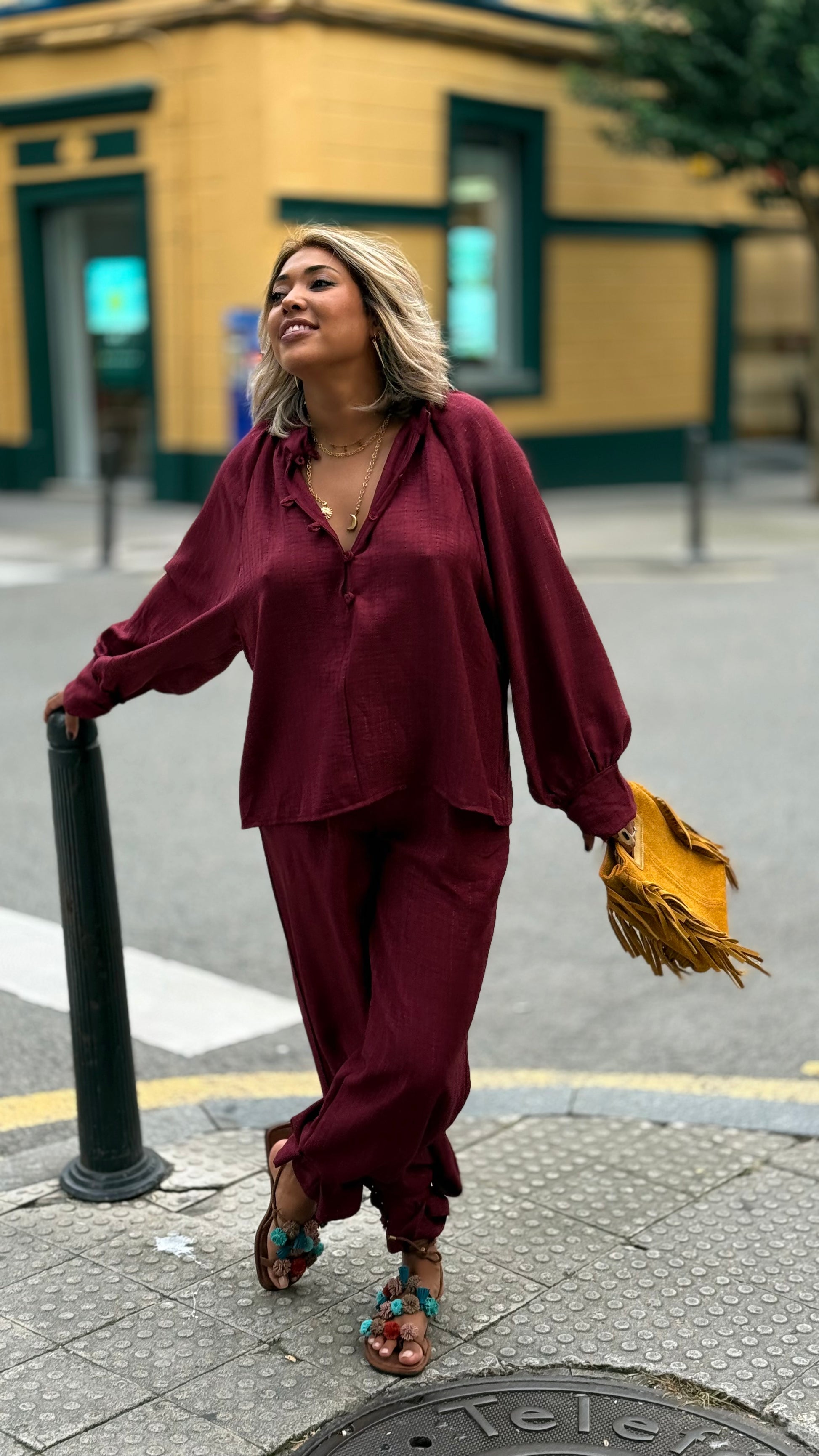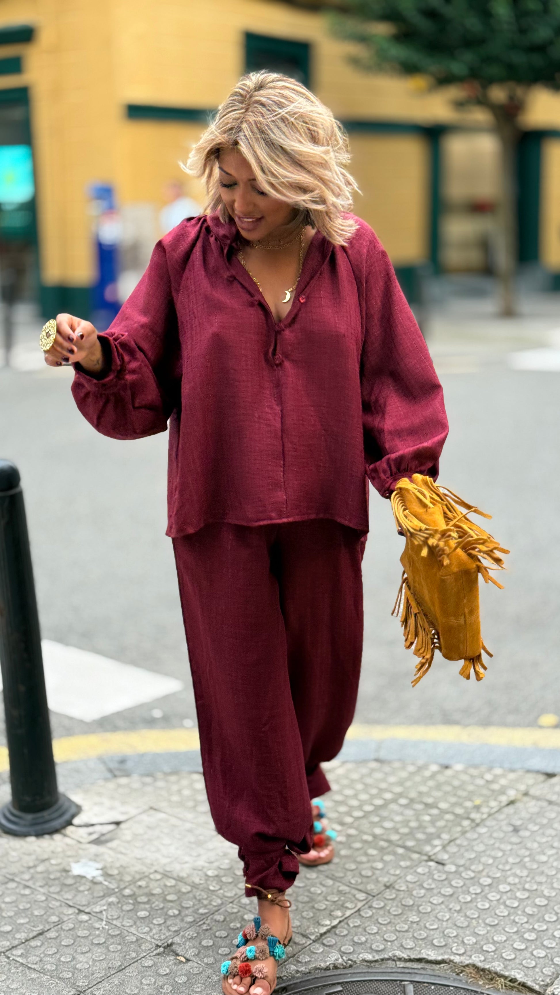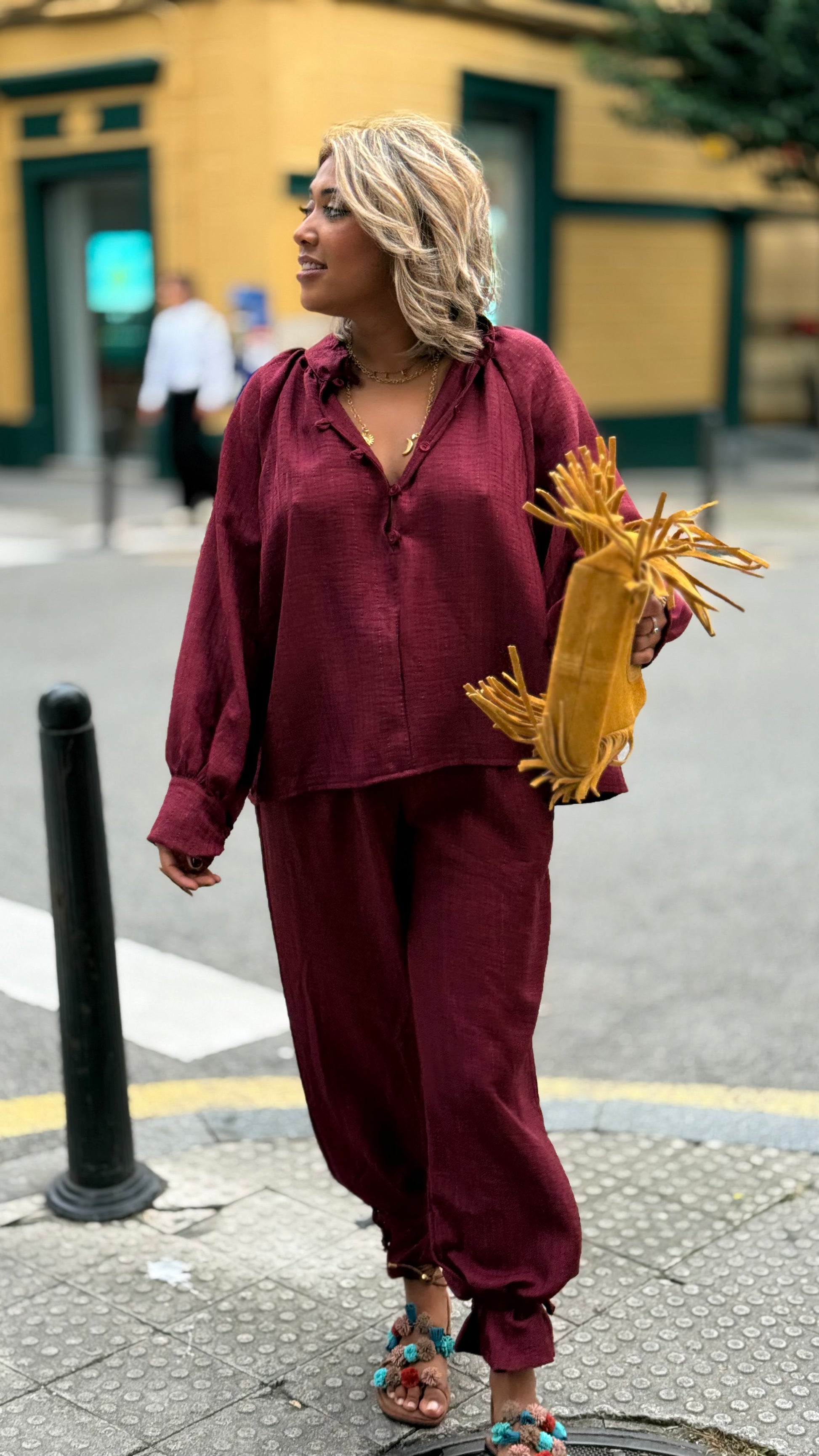 Conjunto de blusa y pantalón amplio con detalles de tendencia, como botones medios, cinturilla elástica y cuerdas tobilleras. Una opción versátil para esta temporada ofreciendo comodidad y estilo en un conjunto perfecto para cualquier ocasión. ¡Disfruta de la moda bohemia con el Conjunto Bohem