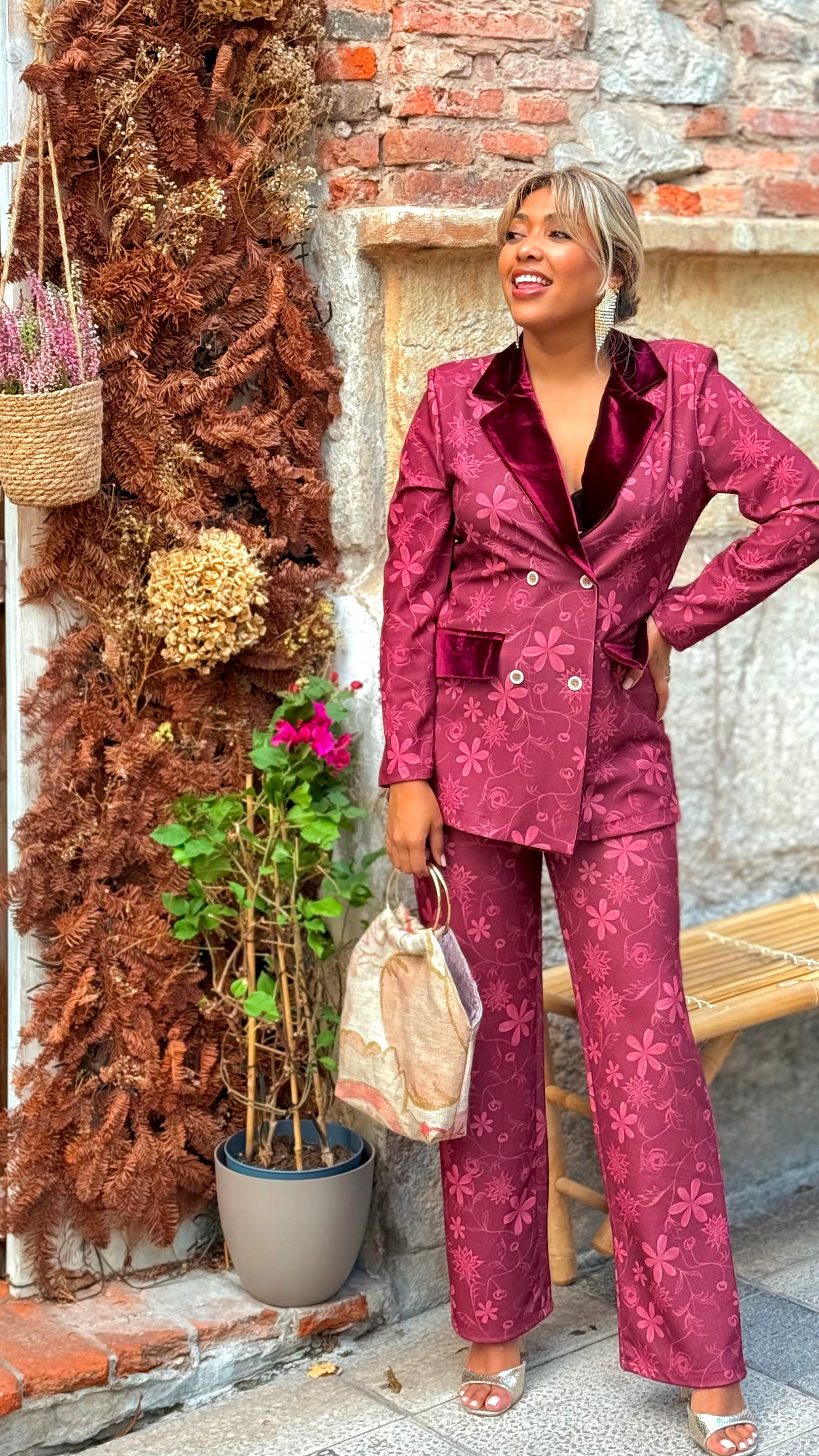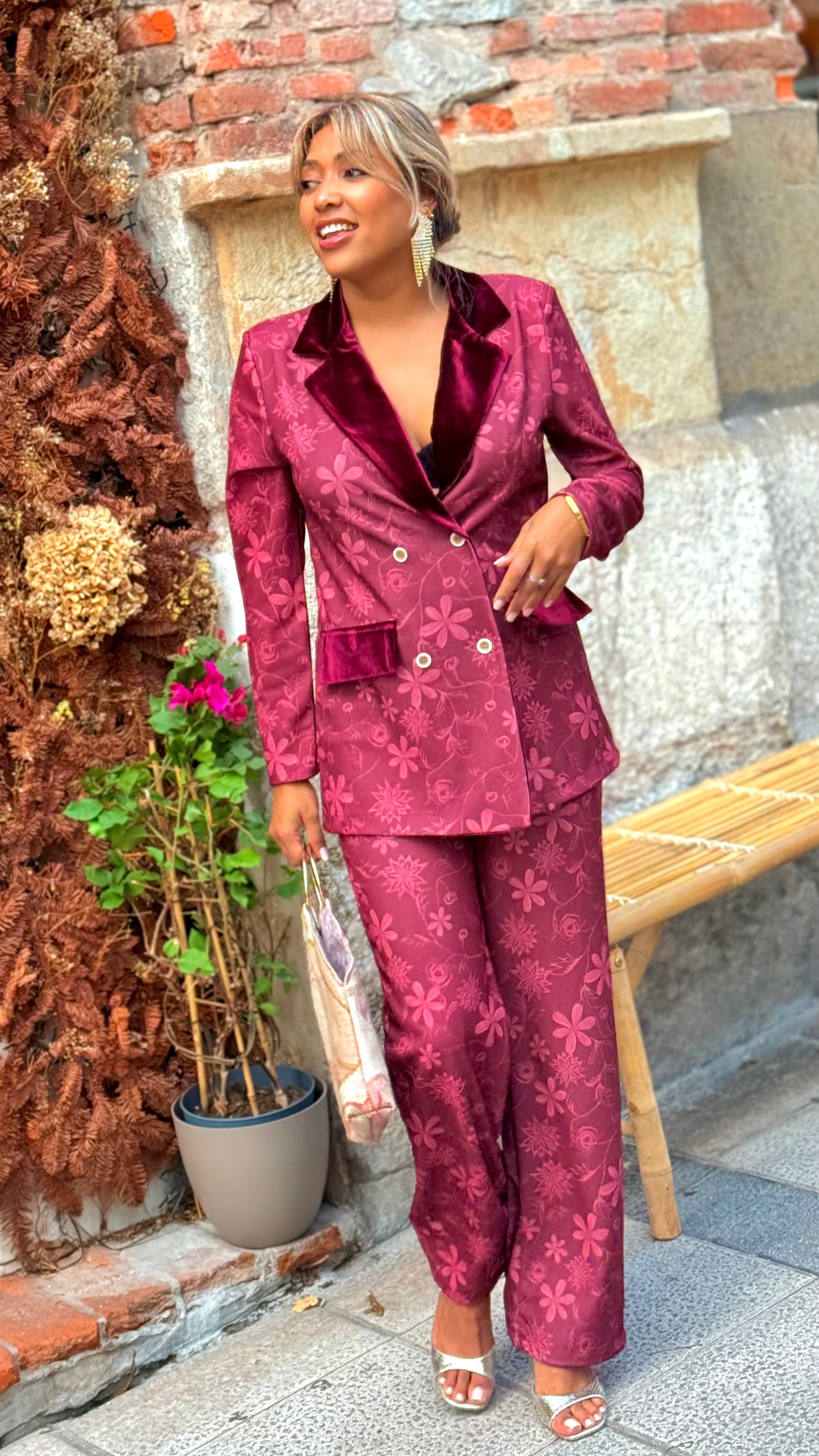 Conjunto Brumel, elegante y con estilo para cualquier ocasión. Blazer y pantalón con estampado y detalles de terciopelo liso en cuello y bolsillos. Talla única, se adapta a tu figura. Luce sofisticada con el toque de terciopelo en tu conjunto.