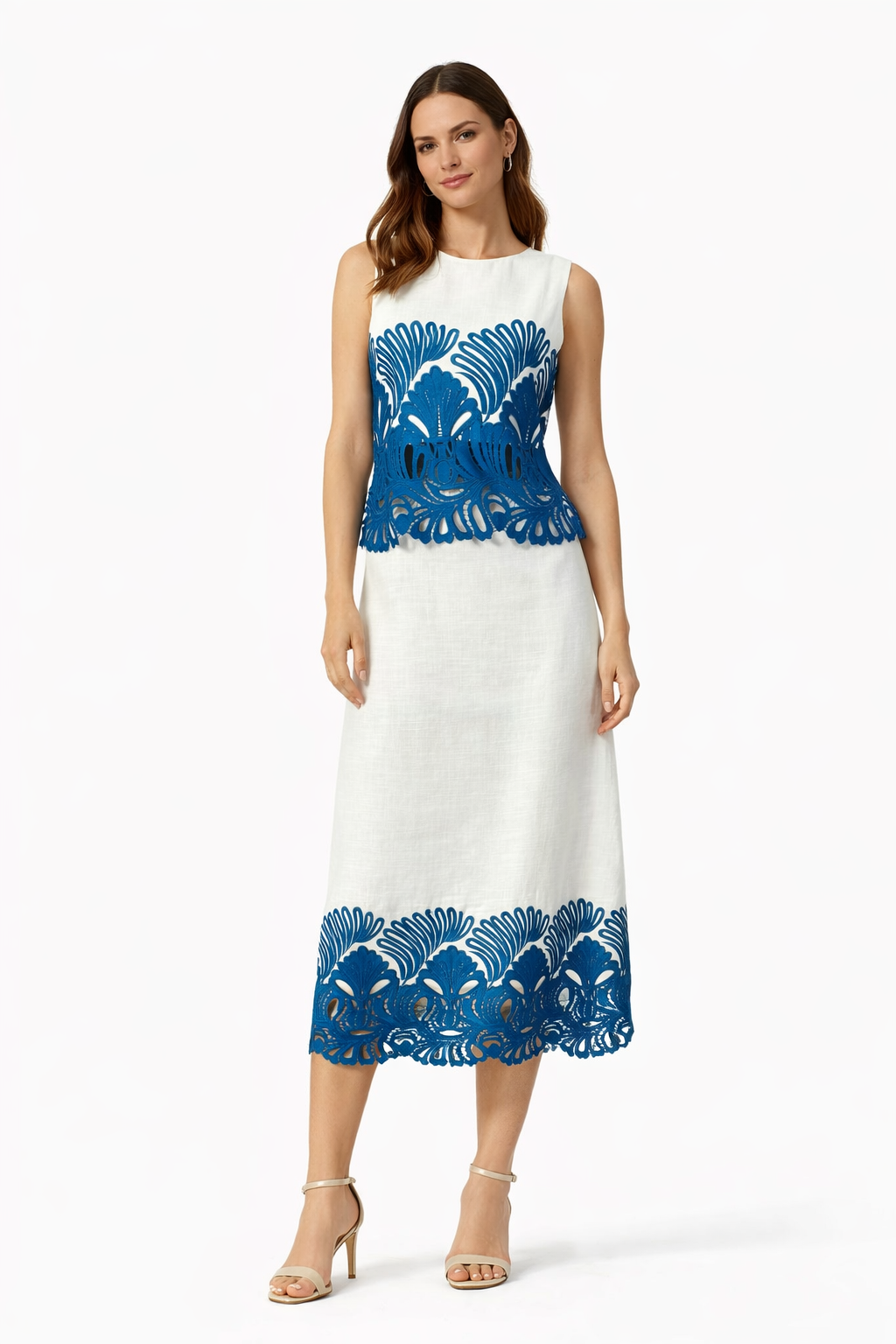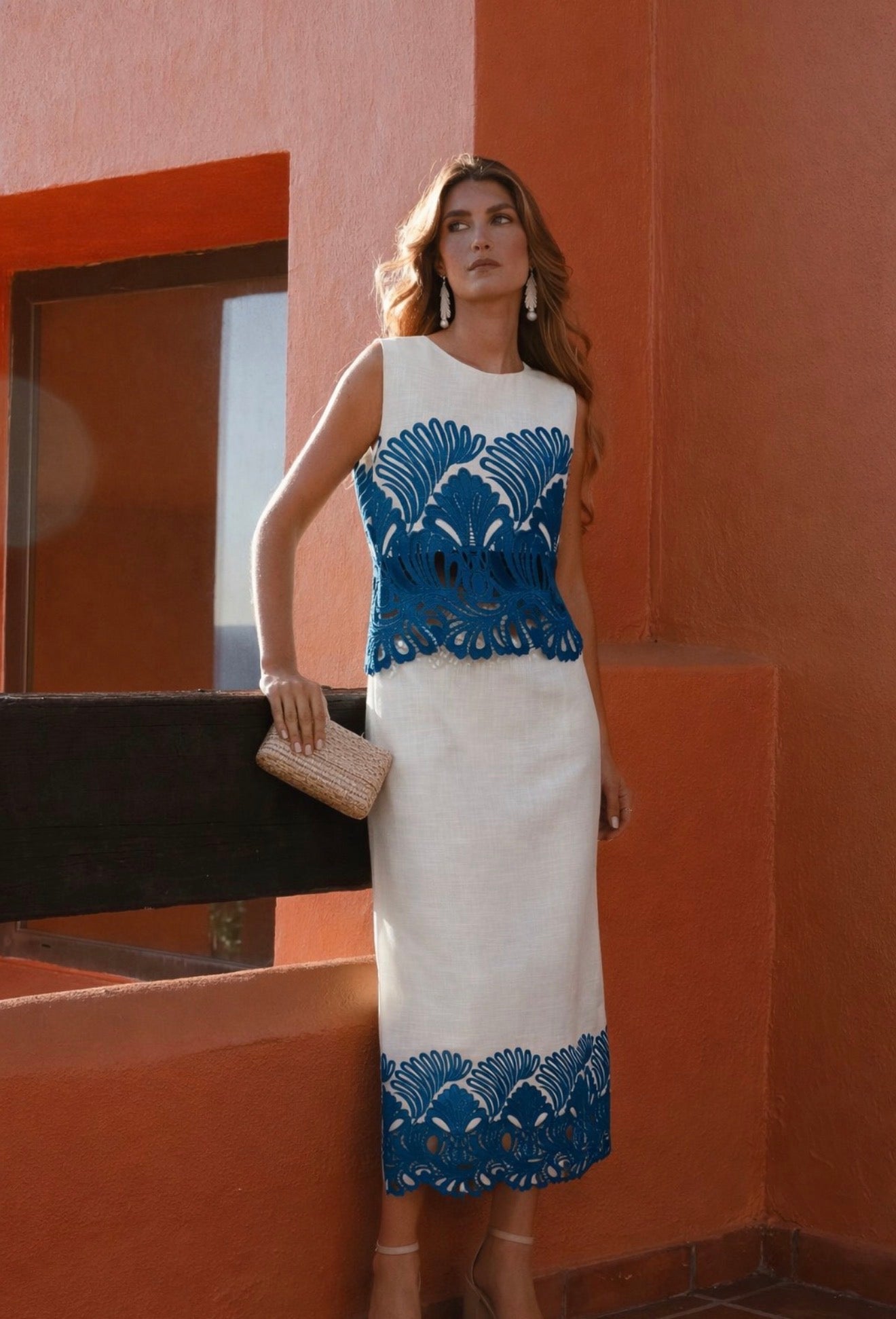 Elegancia luminosa con un toque artesanal. Este conjunto de dos piezas combina un top estructurado sin mangas con falda midi de corte recto, ambos en blanco puro con un espectacular bordado calado en azul intenso.