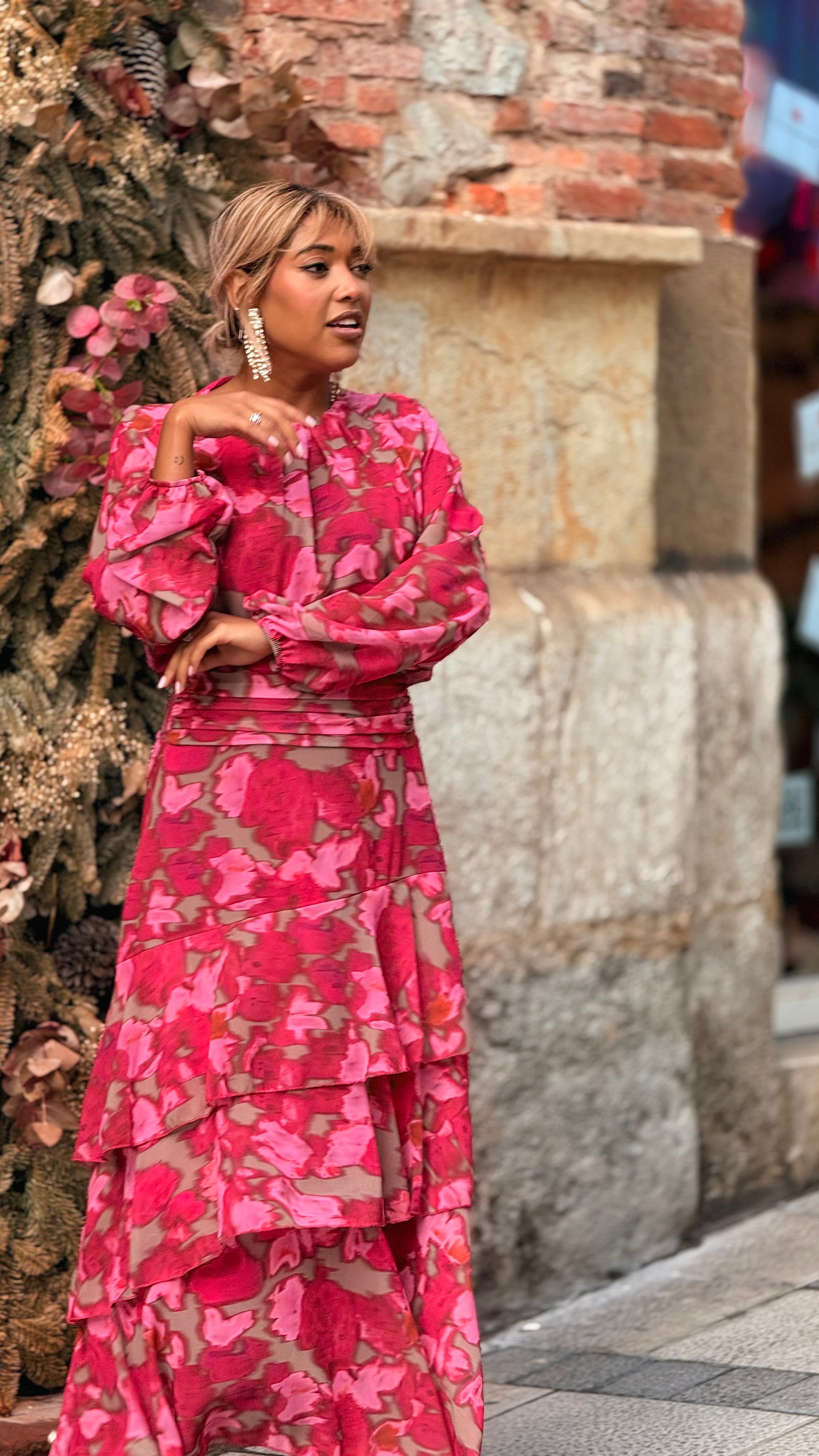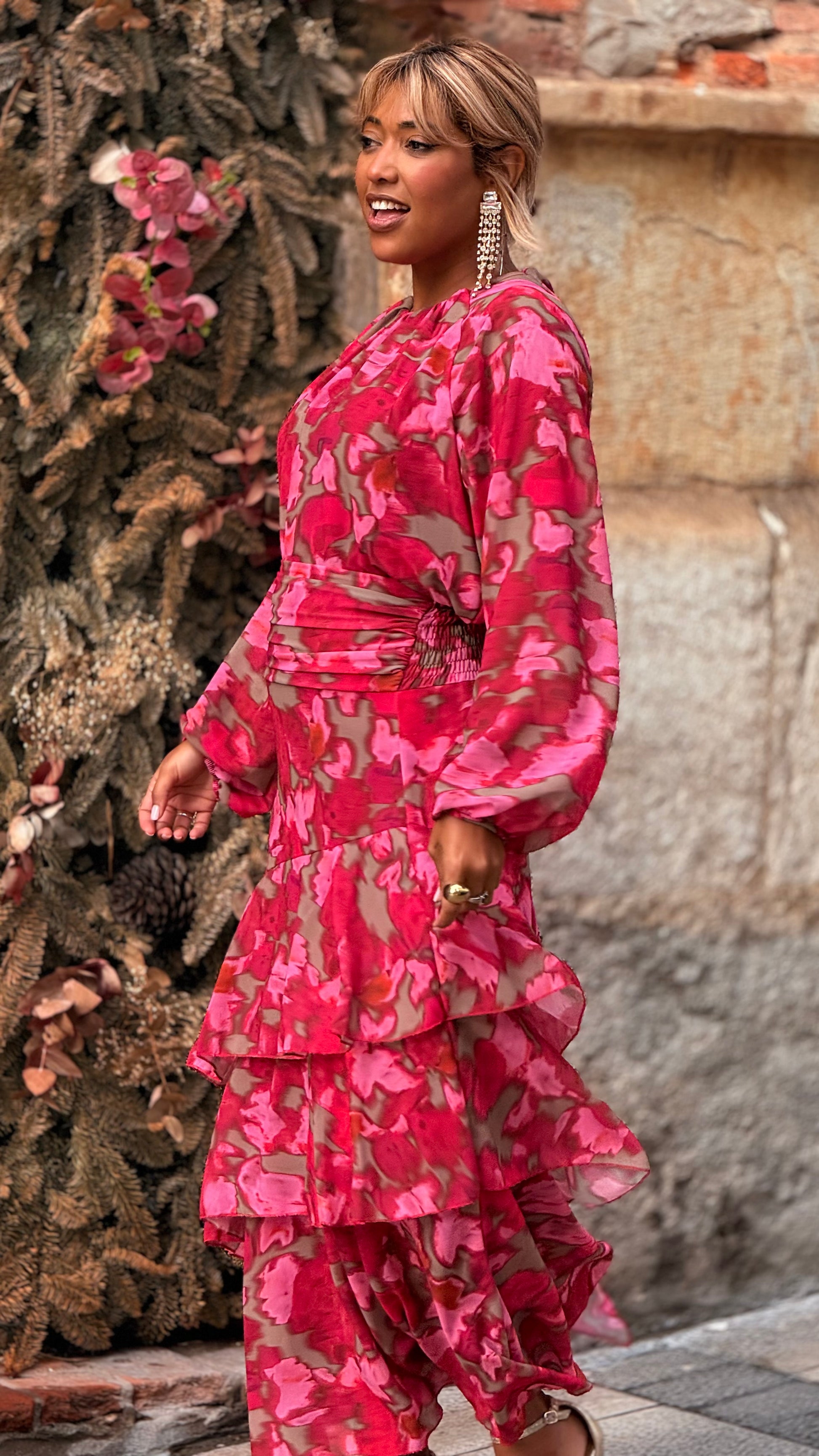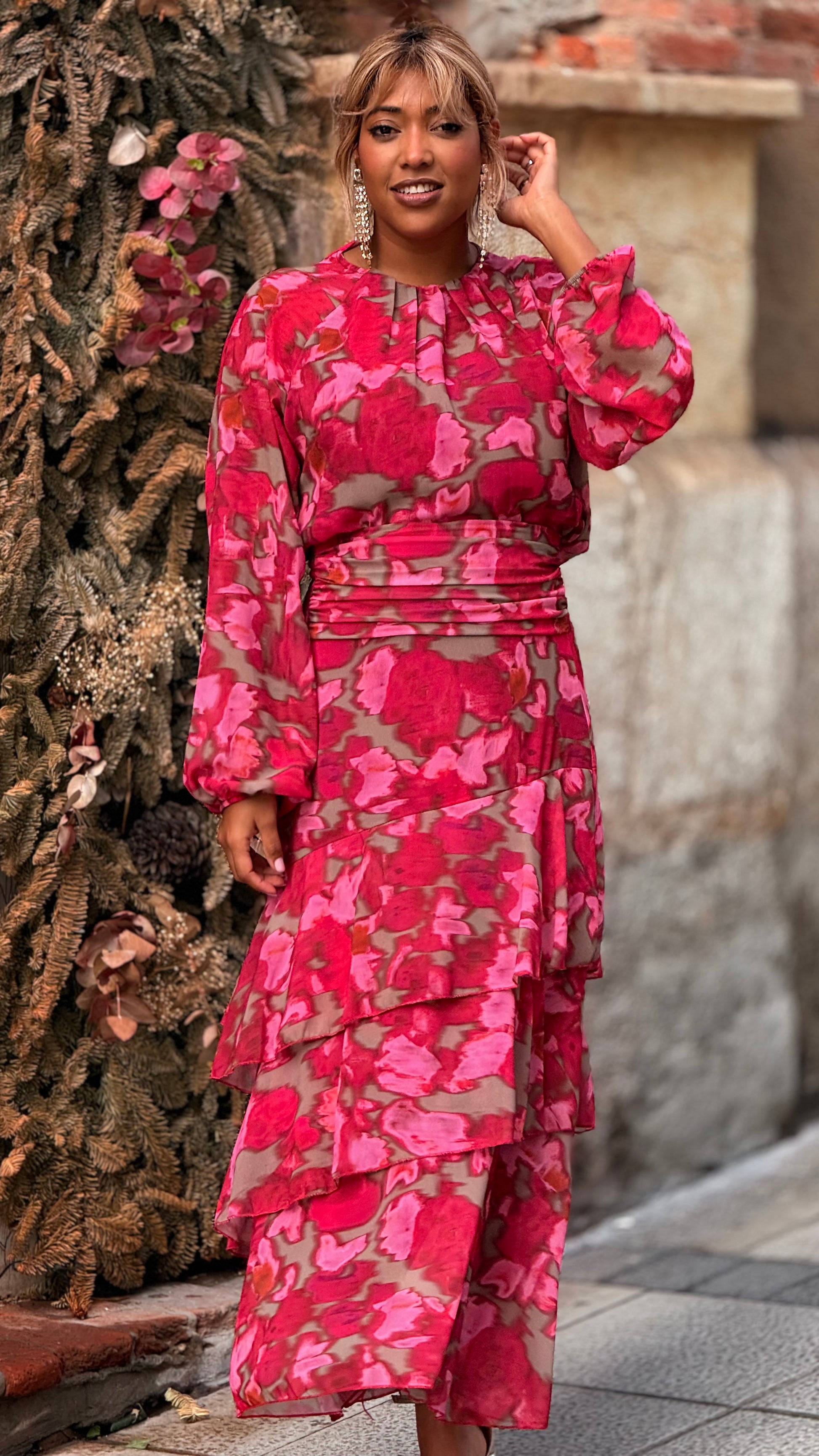 La falda midi de capas destaca por su movimiento y estructura. El detalle fruncido en la cintura estiliza y realza la figura, mientras que las capas aportan dinamismo y un aire romántico.