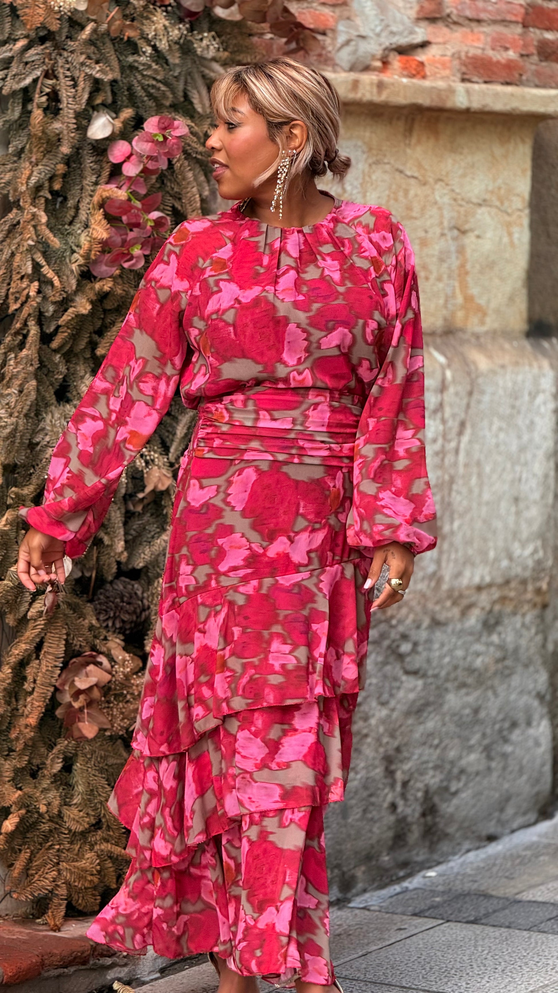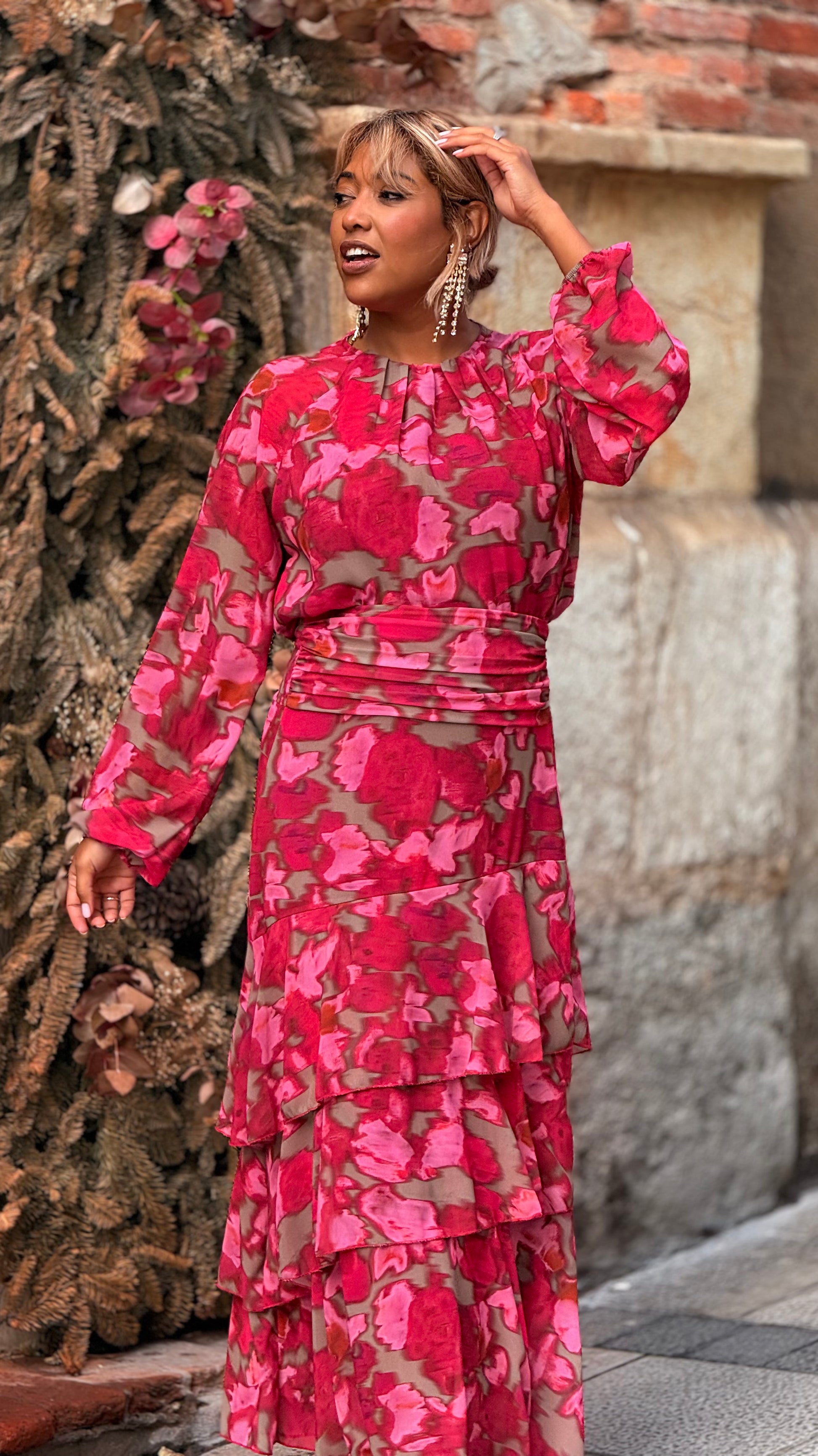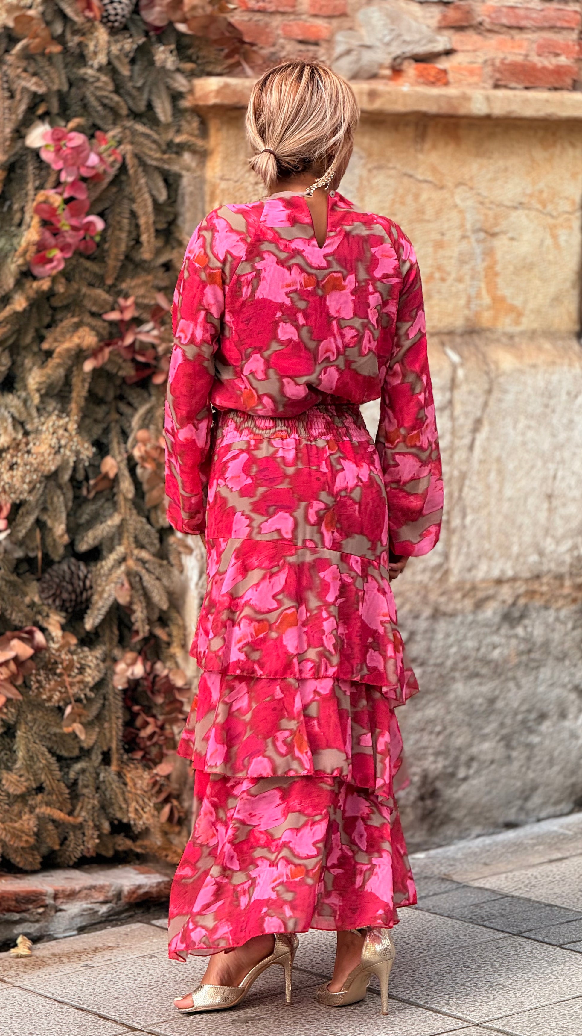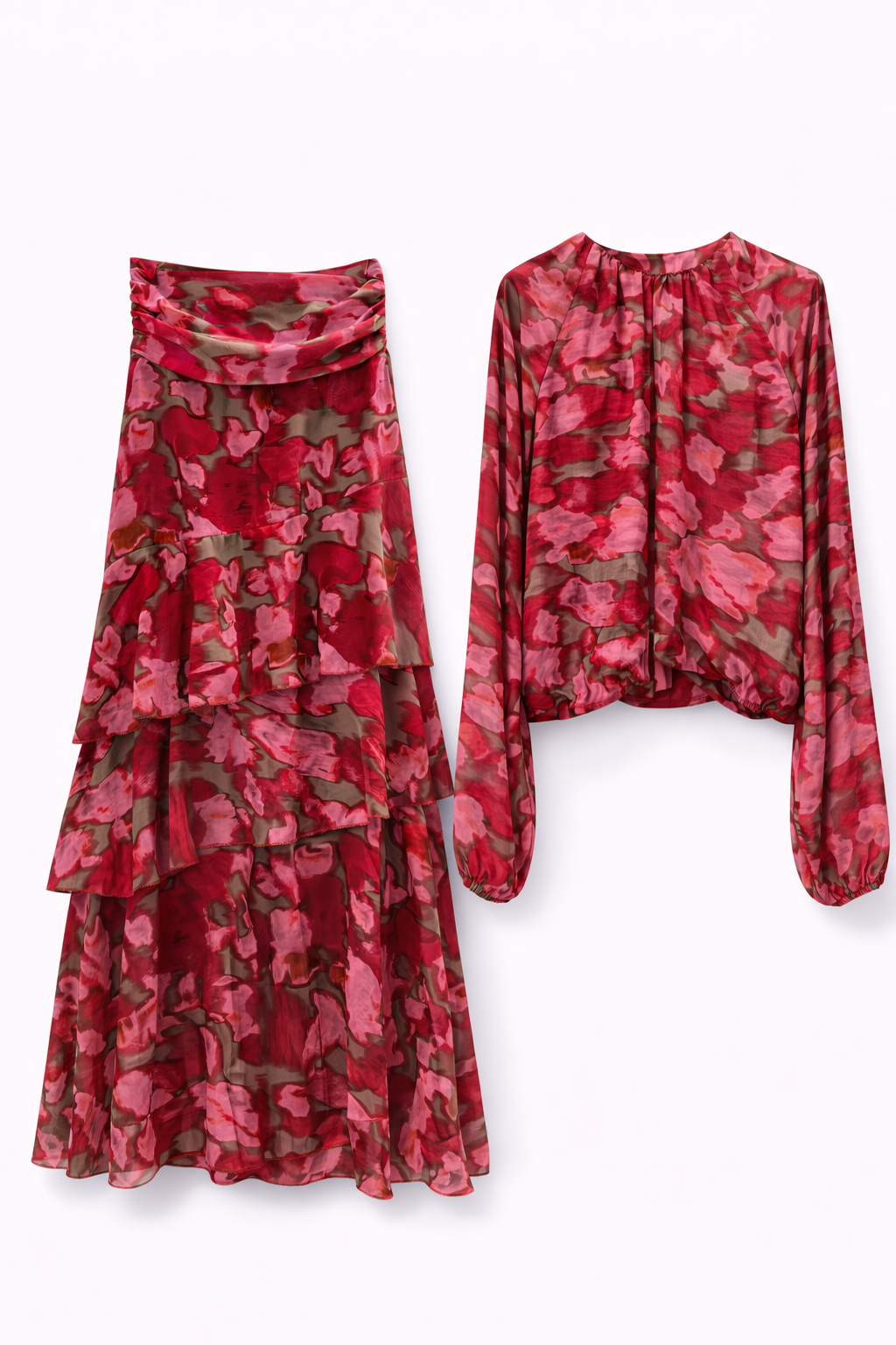Conjunto dos piezas en estampado floral abstracto en tonos rojo, frambuesa y matices tierra que aportan profundidad y sofisticación.