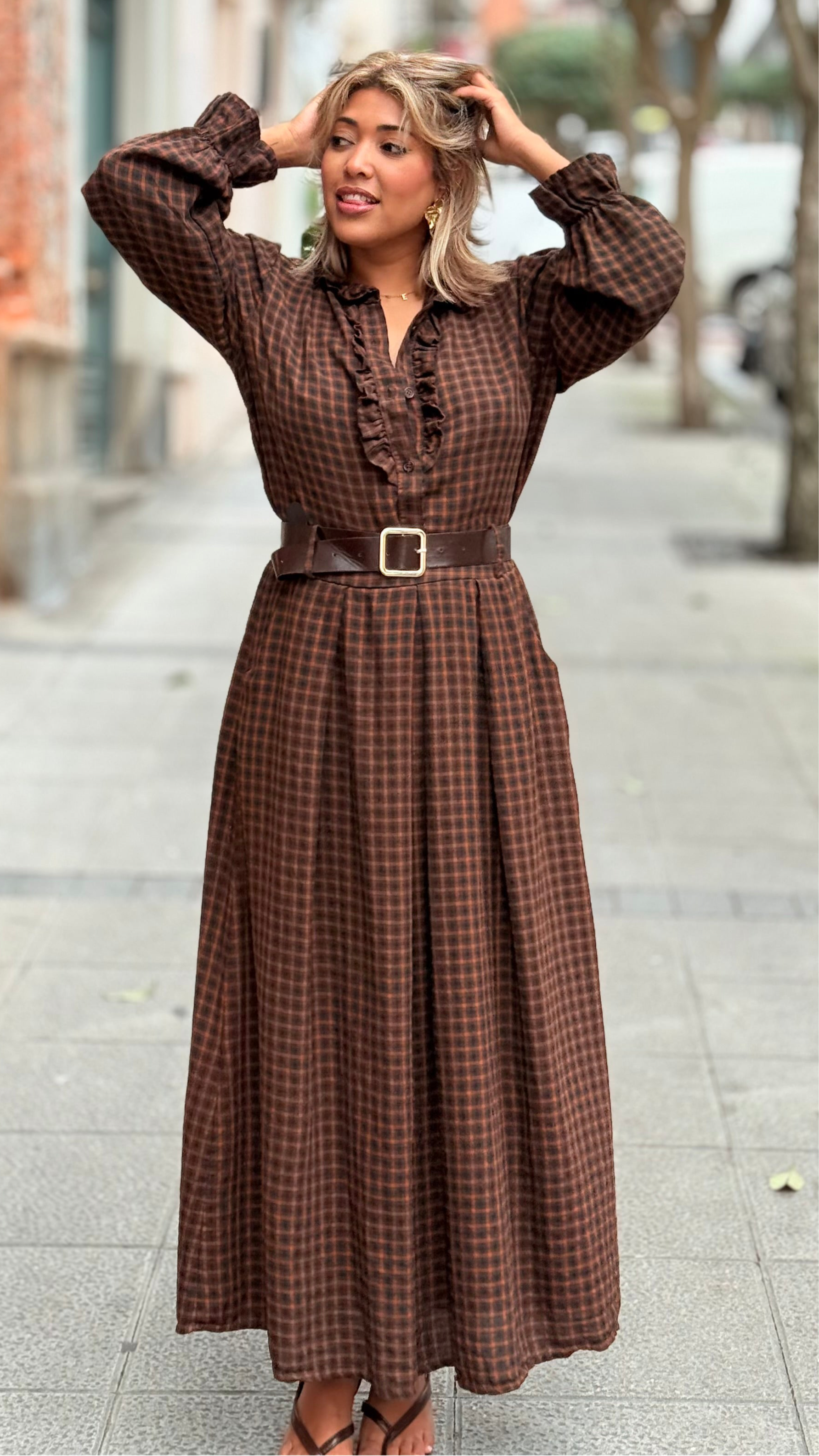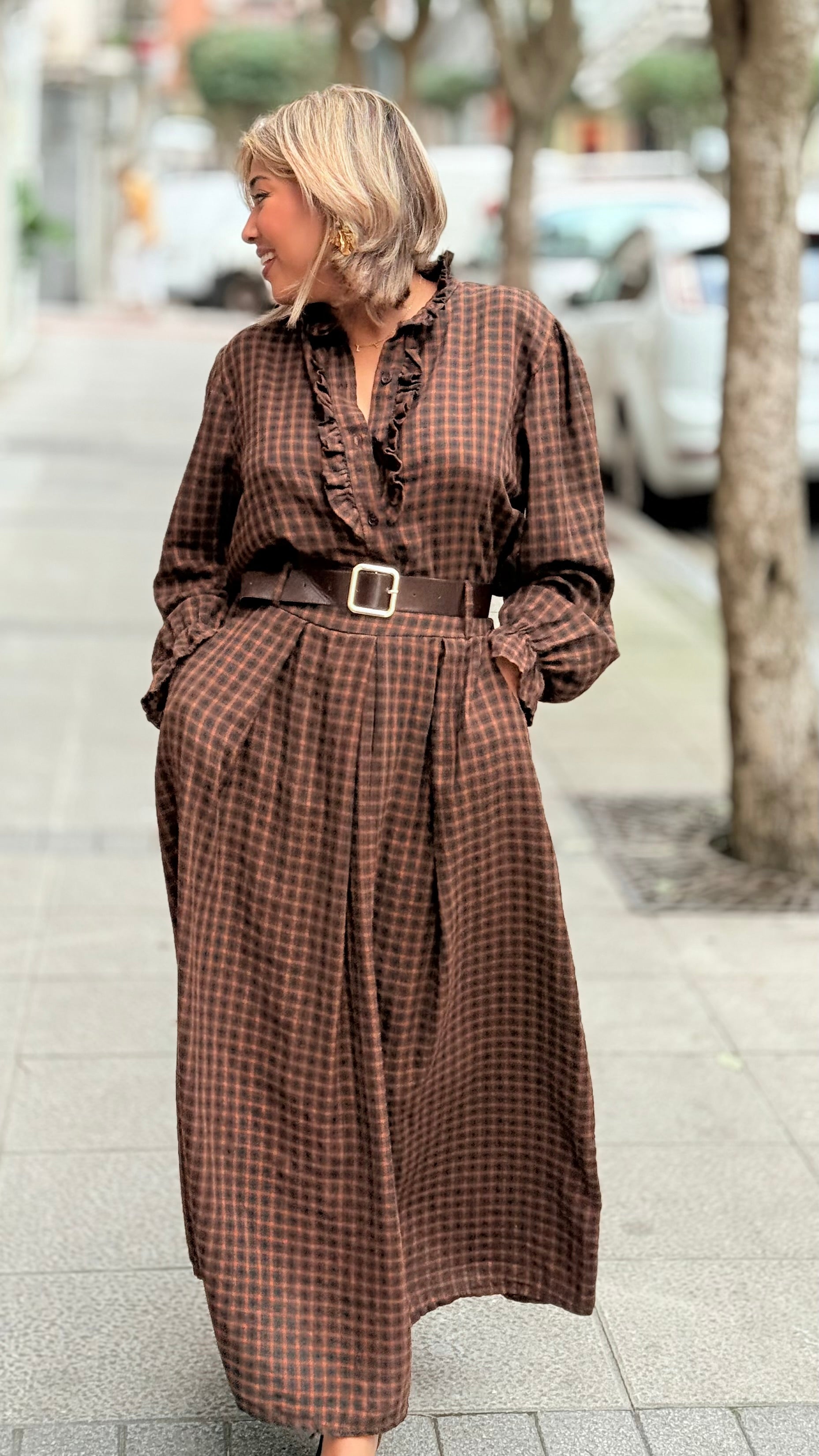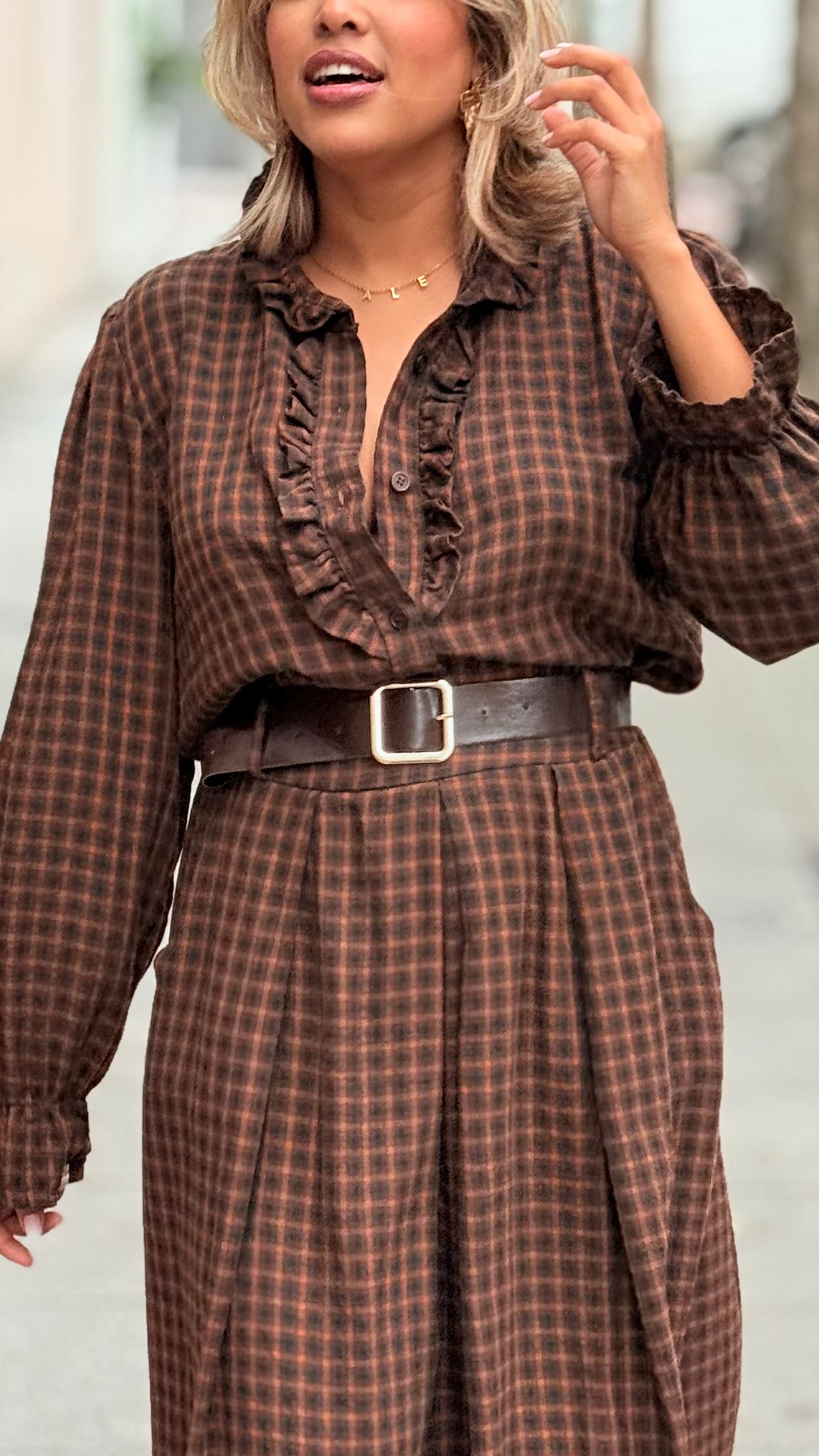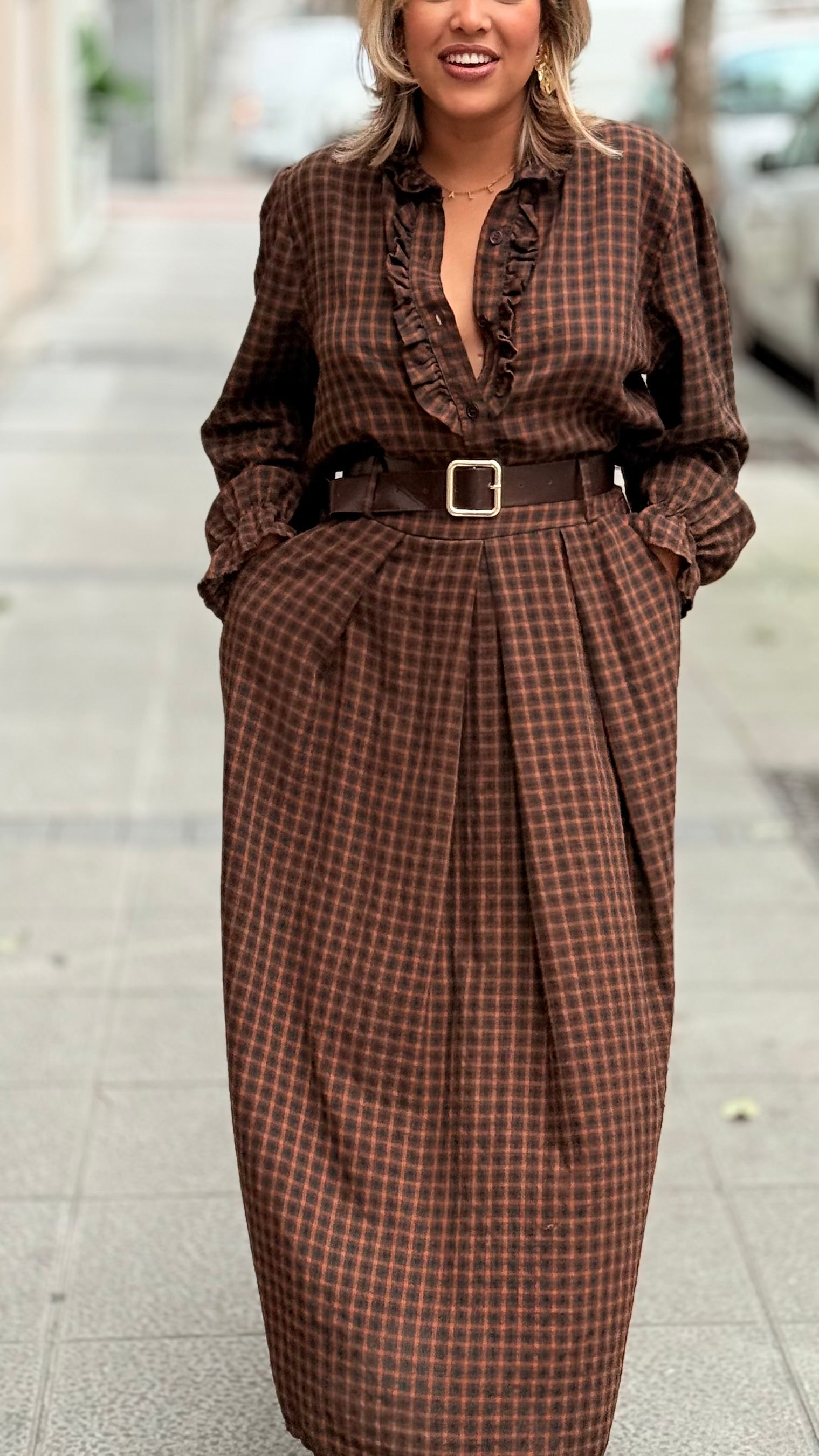 "Conjunto Vicky compuesto por falda y blusa es perfecto para lucir elegante y cómodo. La camisa con volantes en los botones y la falda con cinturilla elástica y cinturón incorporado se ajustan a tu cuerpo de manera ideal. Disponible en dos combinaciones de colores preciosos