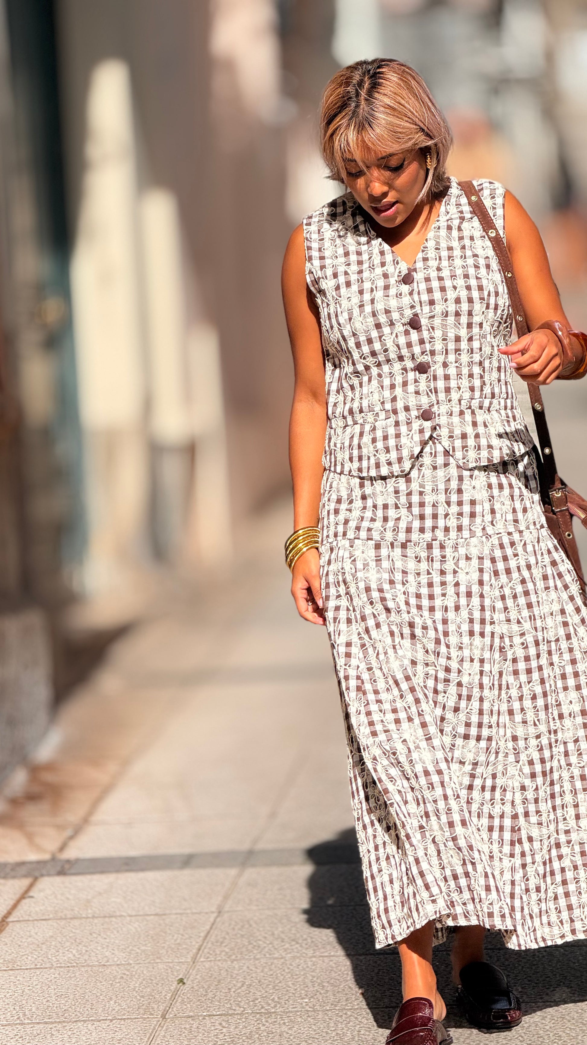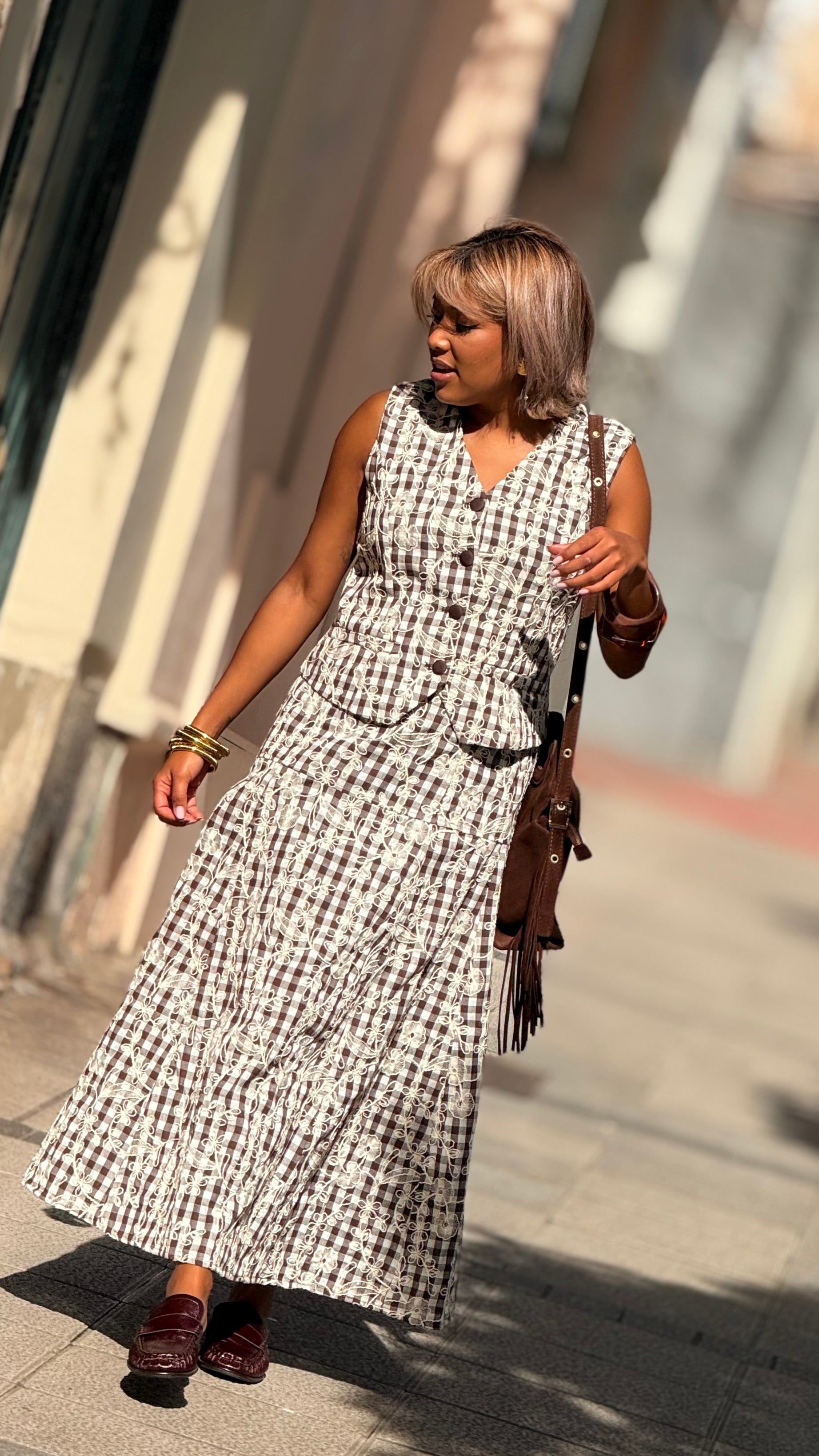 Conjunto compuesto por chaleco y falda en algodón 100% y detalles bordados por toda las prendas