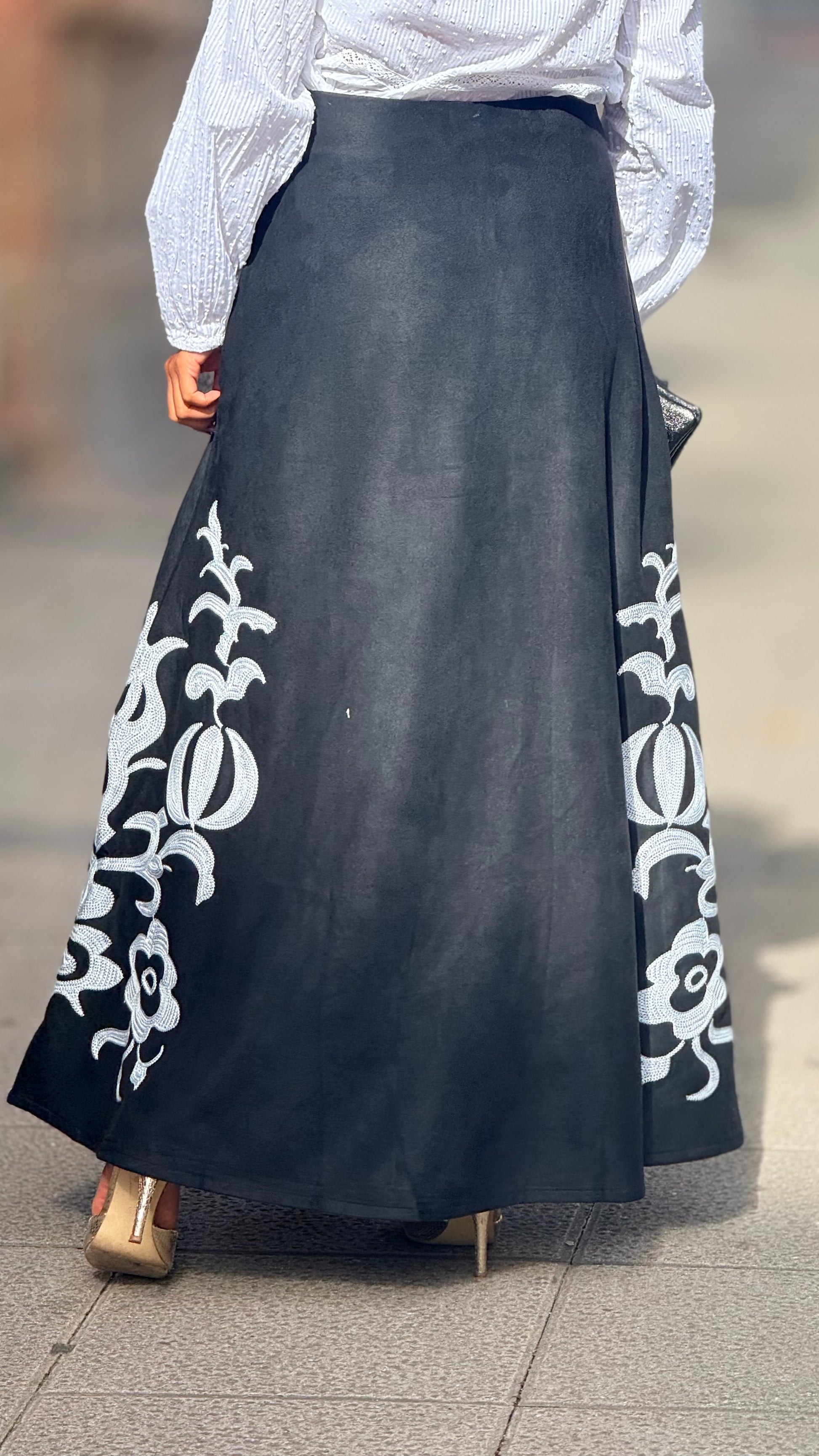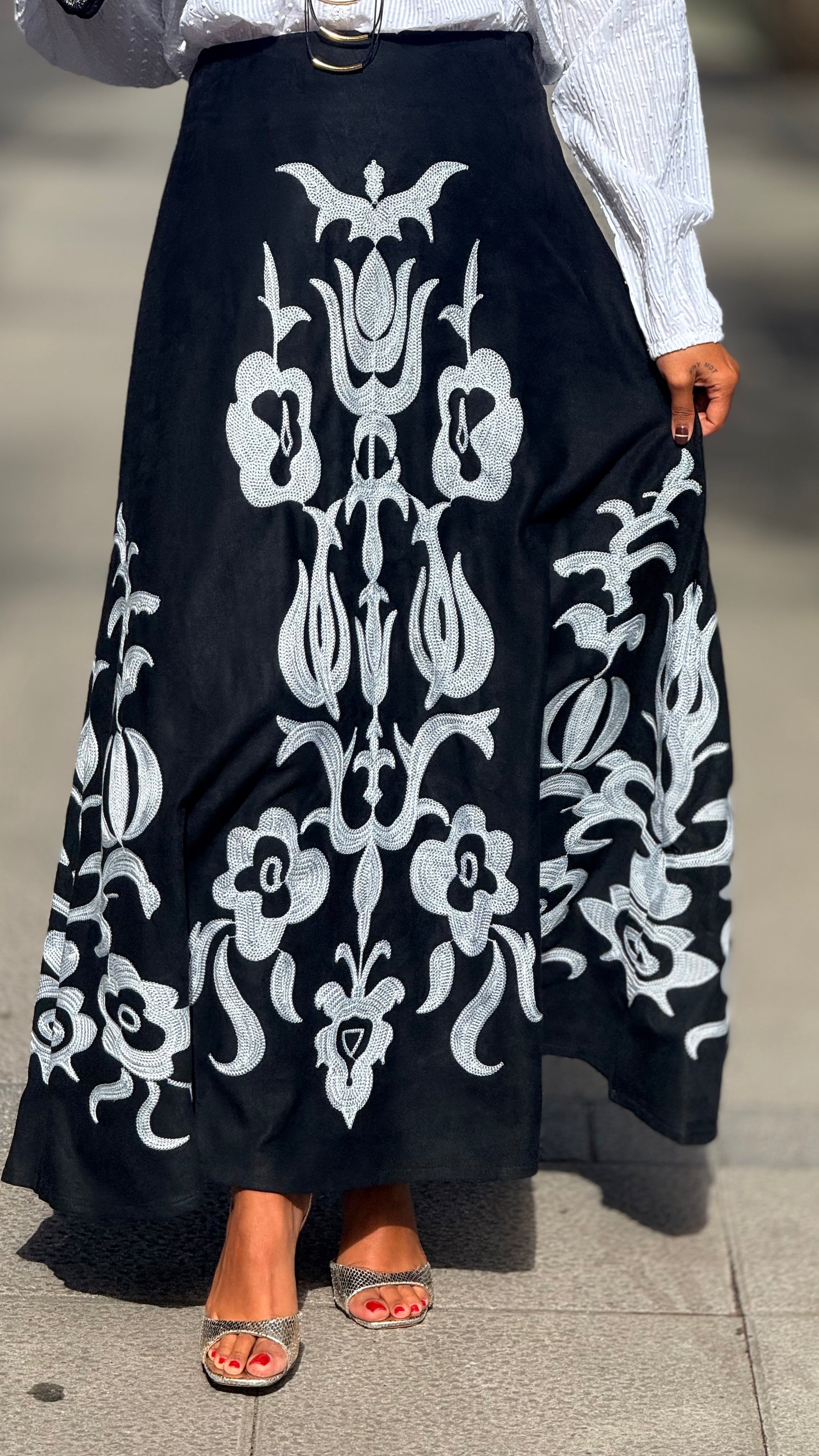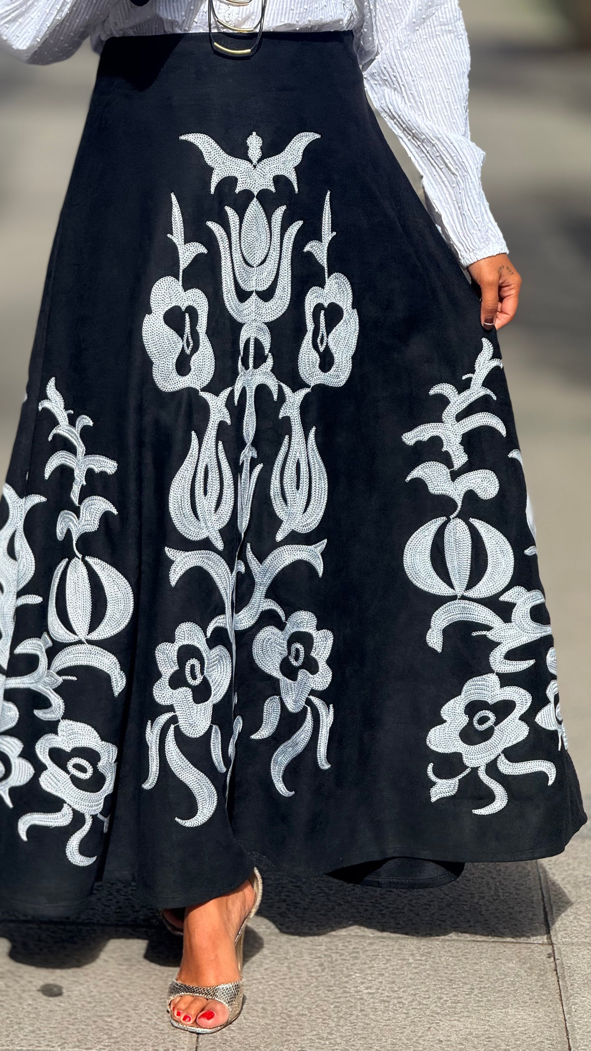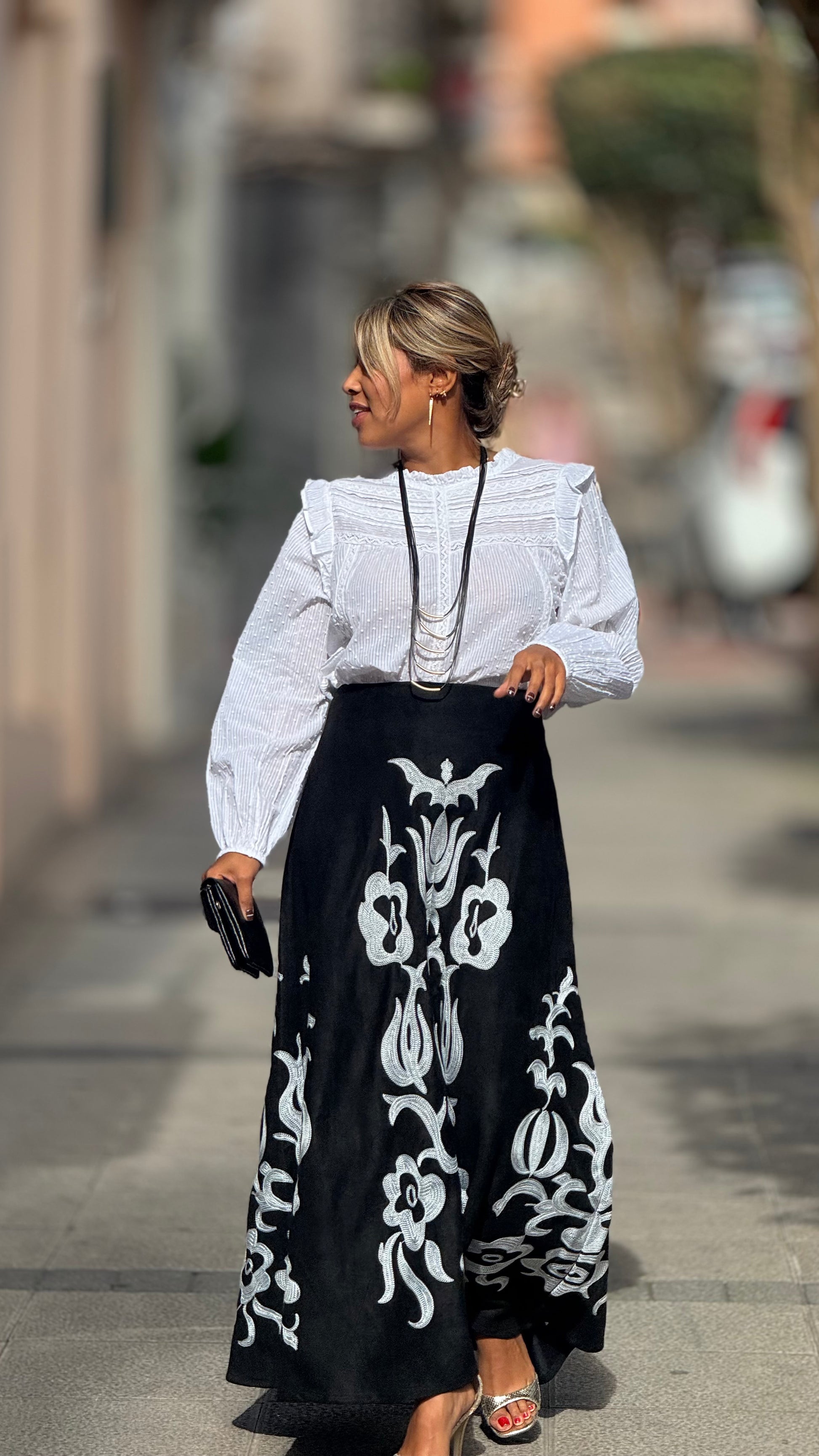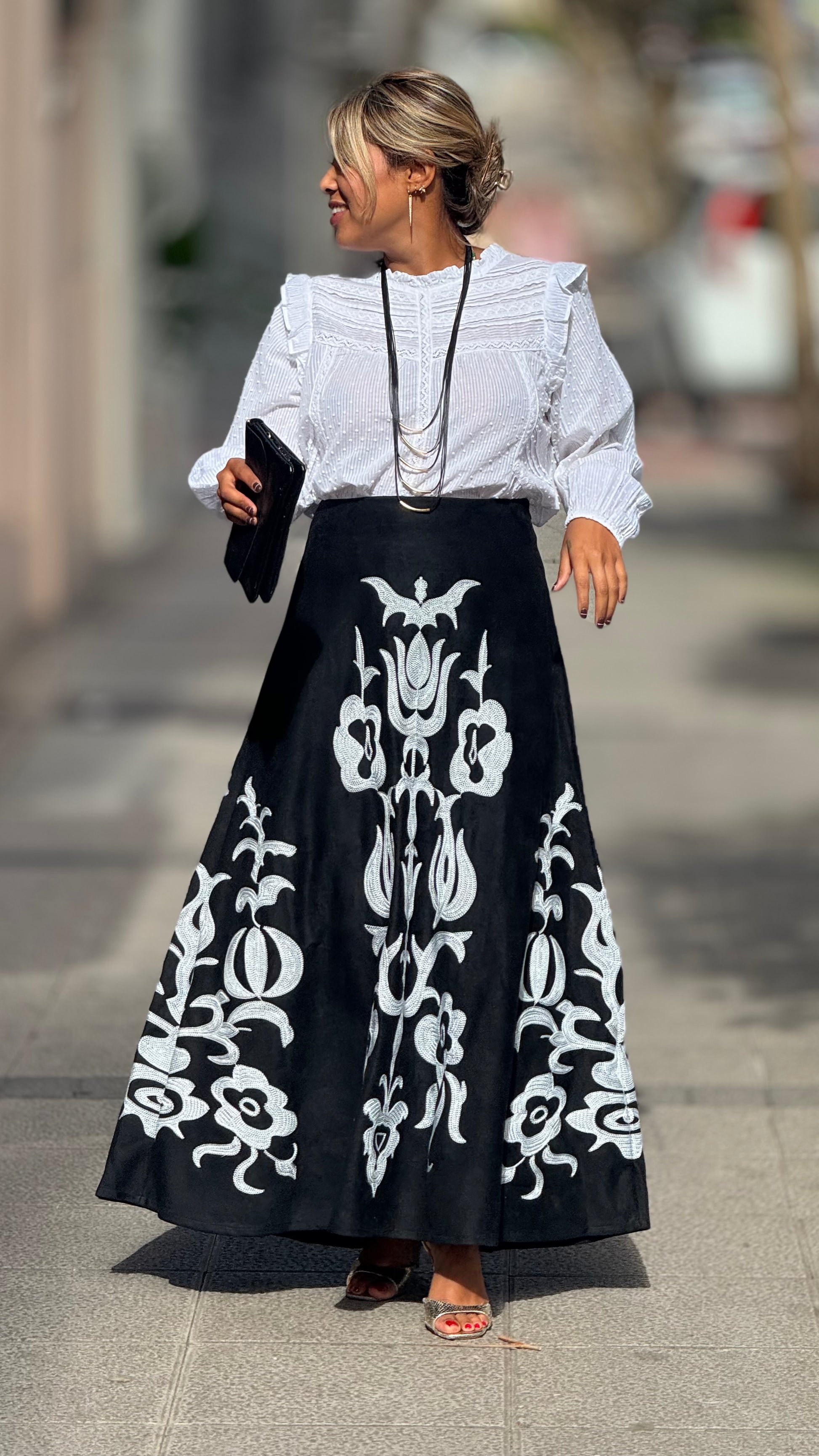 Falda en tela de Angelina con detalle de bordados en tono blanco, cremallera invisible lateral