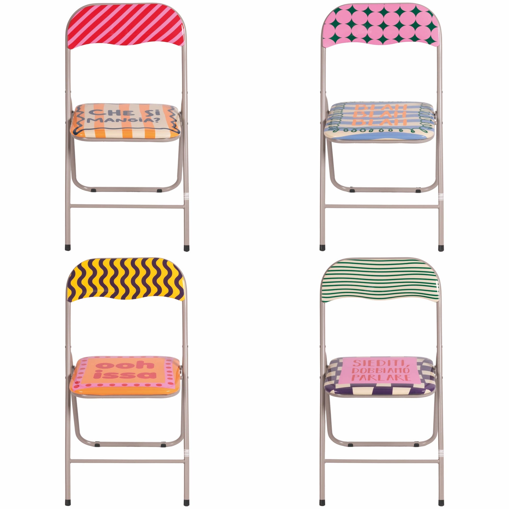 Silla plegable More Amor Estructura tubular de acero al carbono Asiento de madera MDF y PVC Relleno de esponja (PP) Plegable y ahorra espacio Cómoda para guardar y transportar gracias a su mínimo peso y volumen Con inscripción Peso máximo soportado: 100 kg Tubo: ø 19 mm (Grosor: 0,8 mm) Altura del asiento: 44,5 cm Medidas del asiento: a. 37 x p. 38 cm Medidas de la silla: a. 43,5 x p. 44 x h. 79 cm Medidas de la silla cerrada: a. 43,5 x p. 4 x h. 88,5 cm Color: negro con inscripción blanca Disponible en 4 decoraciones surtidas Limpiar el asiento con un paño