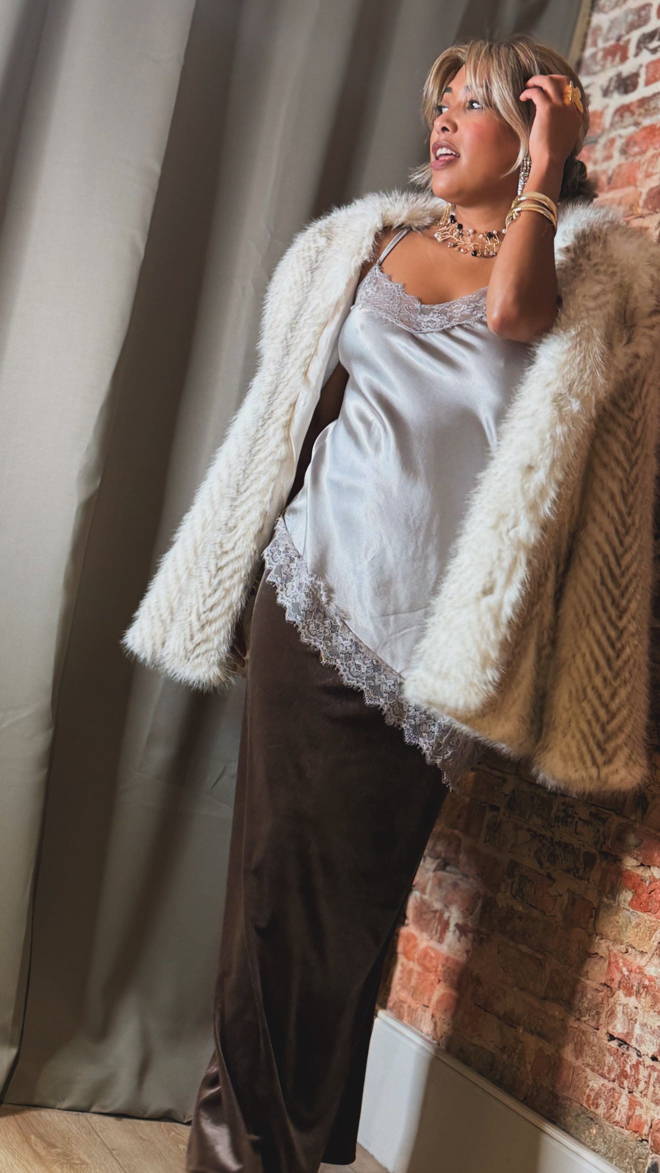 Falda en velvet con detalle de puntilla en lateral. Cinturilla elástica