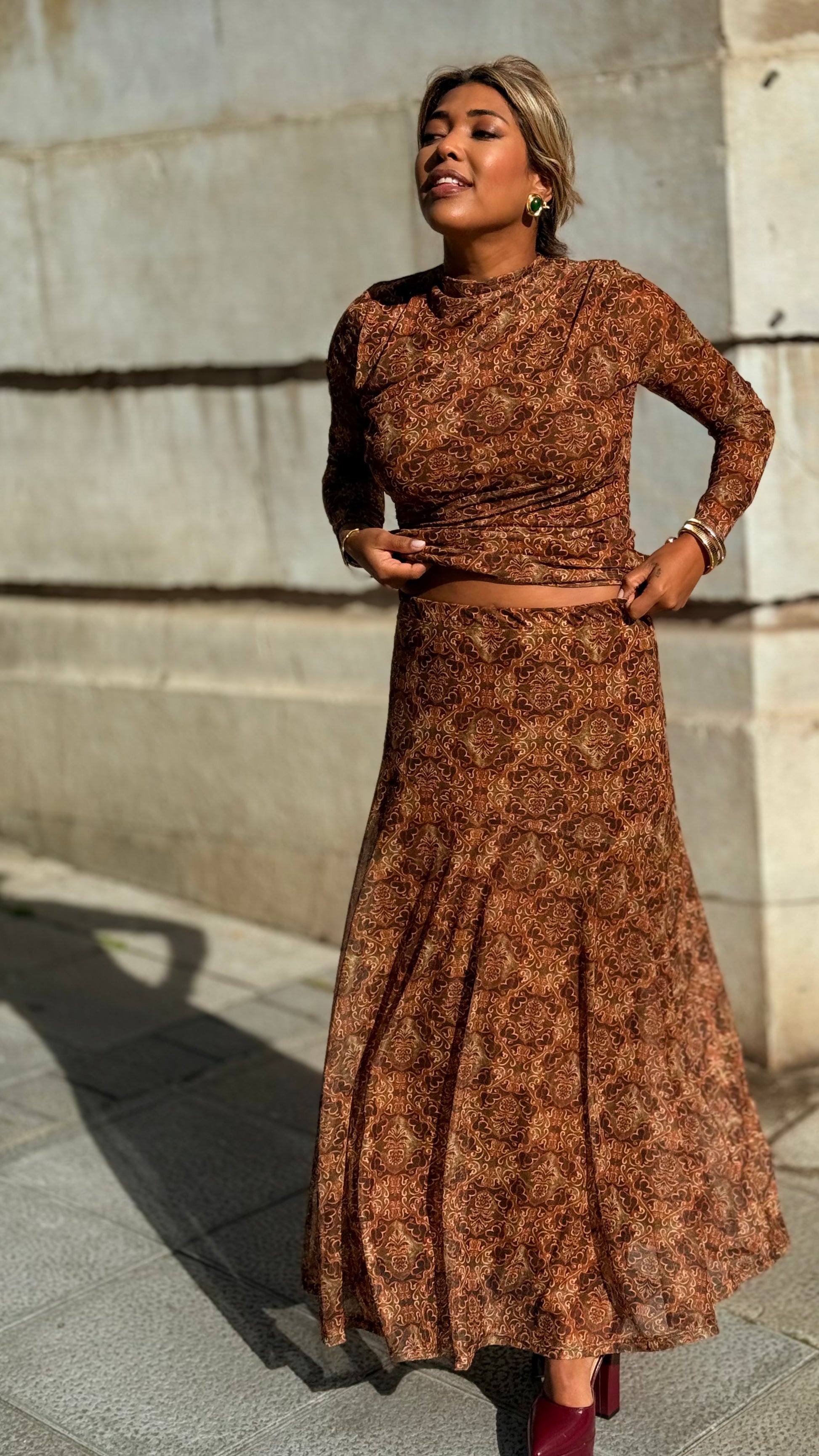 Conjunto Tivoli: Dos piezas en tejido de tul. Falda evasé y top con fruncido en la zona derecha. Brinda comodidad y elegancia con su corte y detalles únicos. Ideal para lucir a la moda en cualquier ocasión.