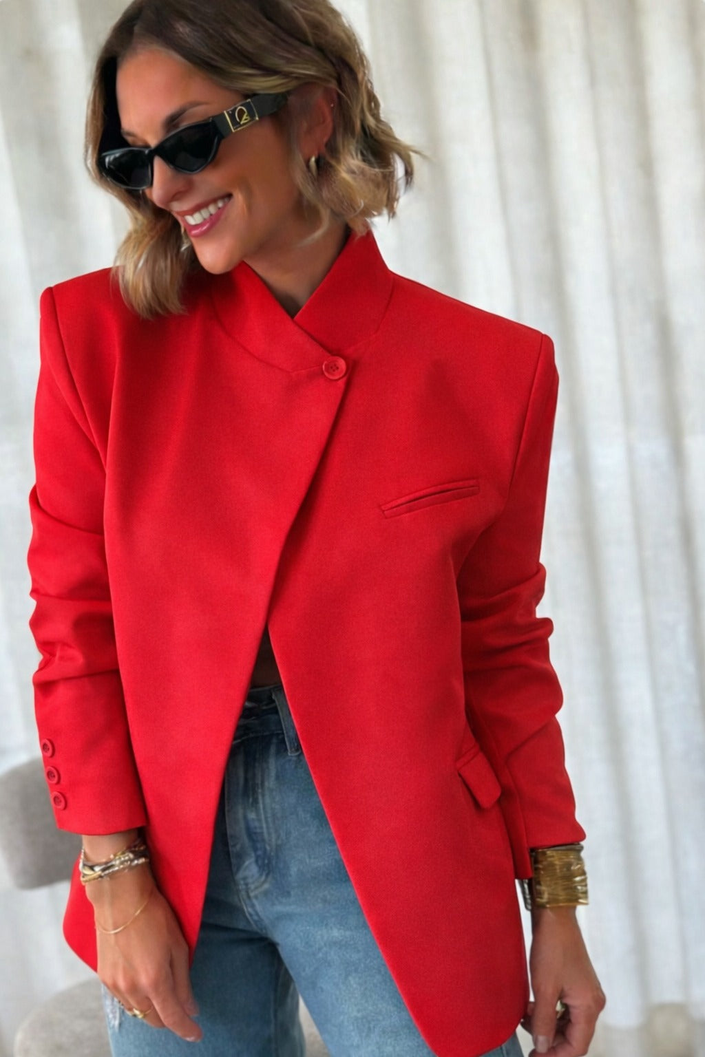 Americanas asimétrica con botones en cuello. Cuenta con bolsillo laterales