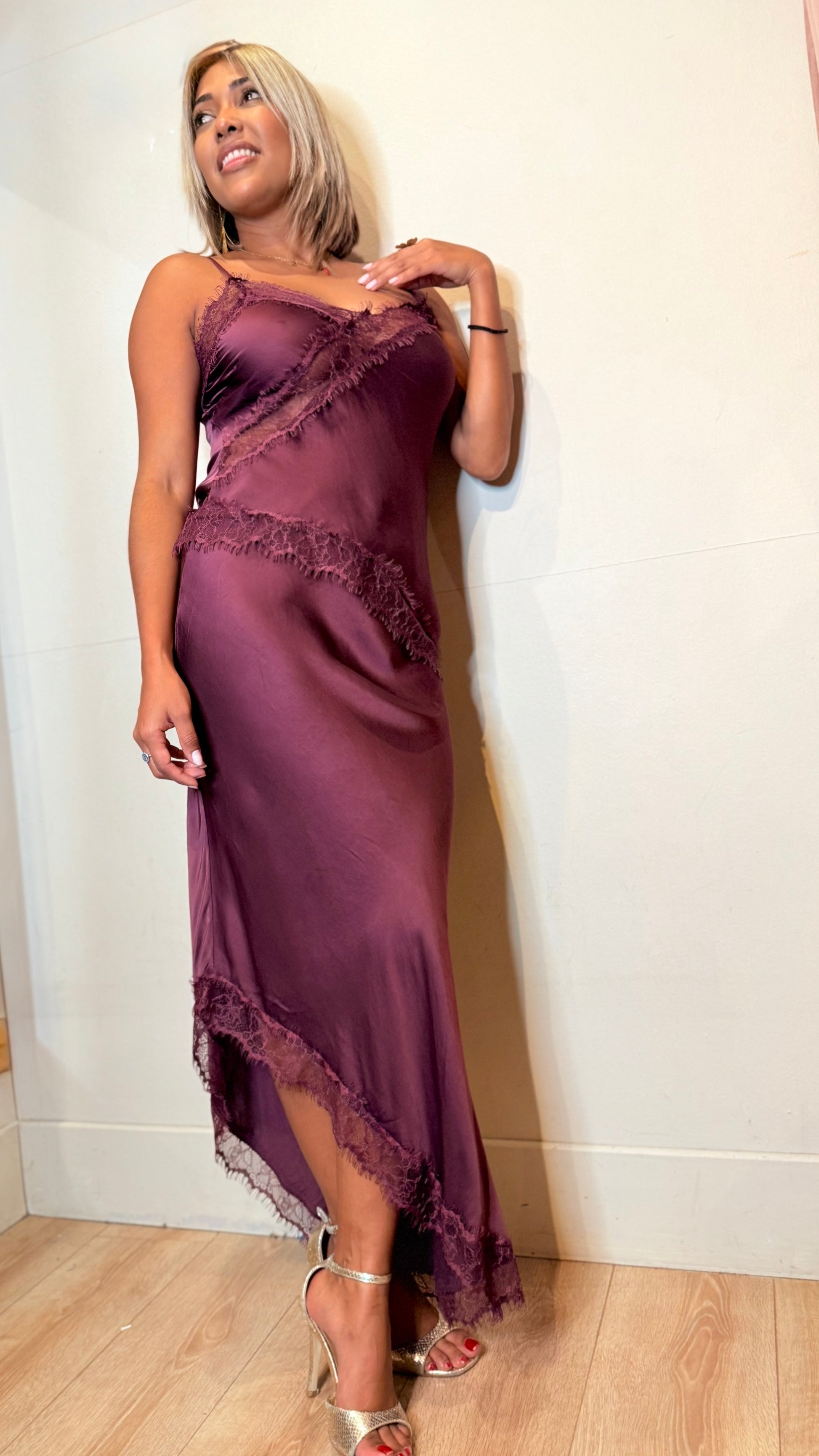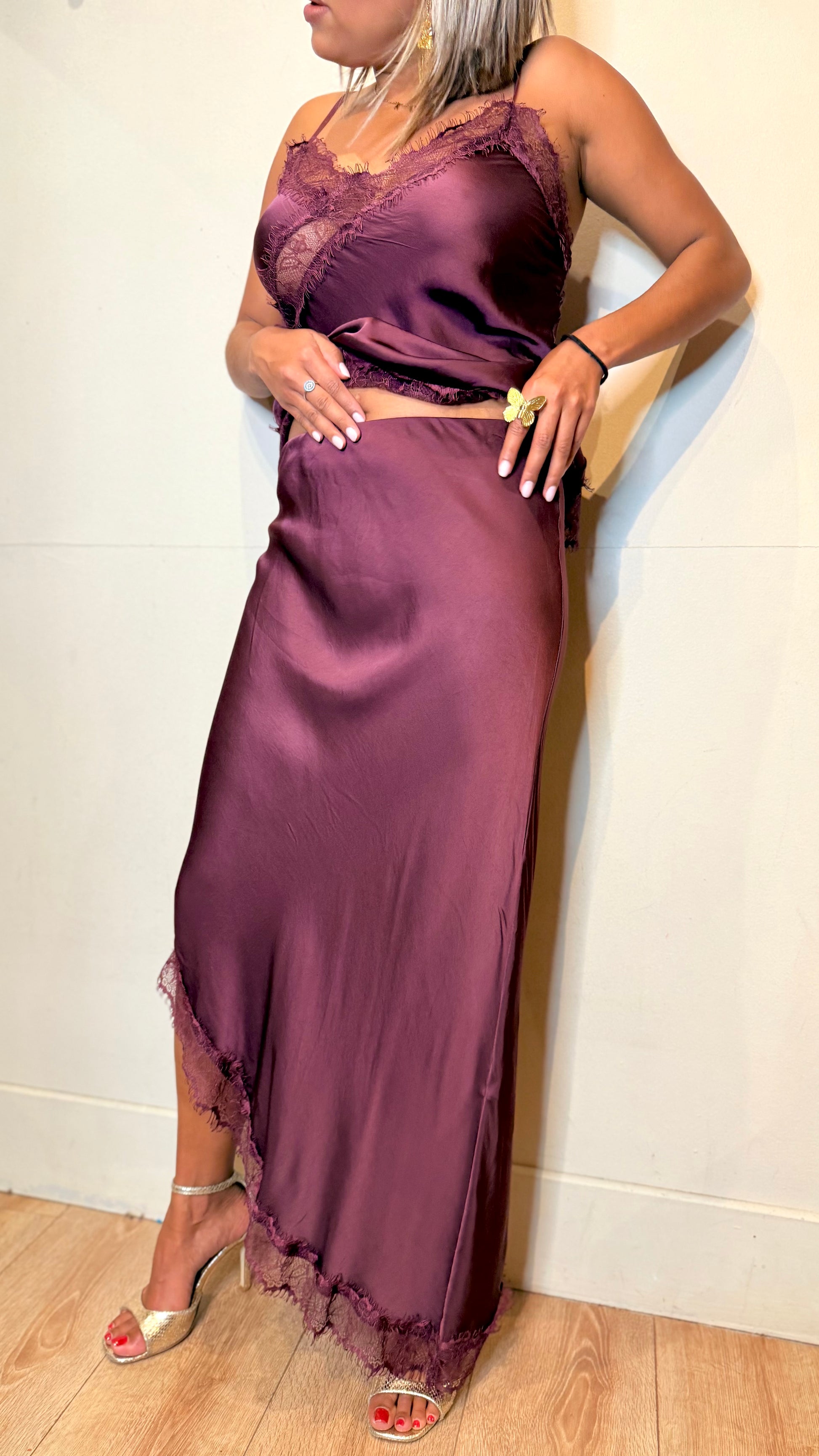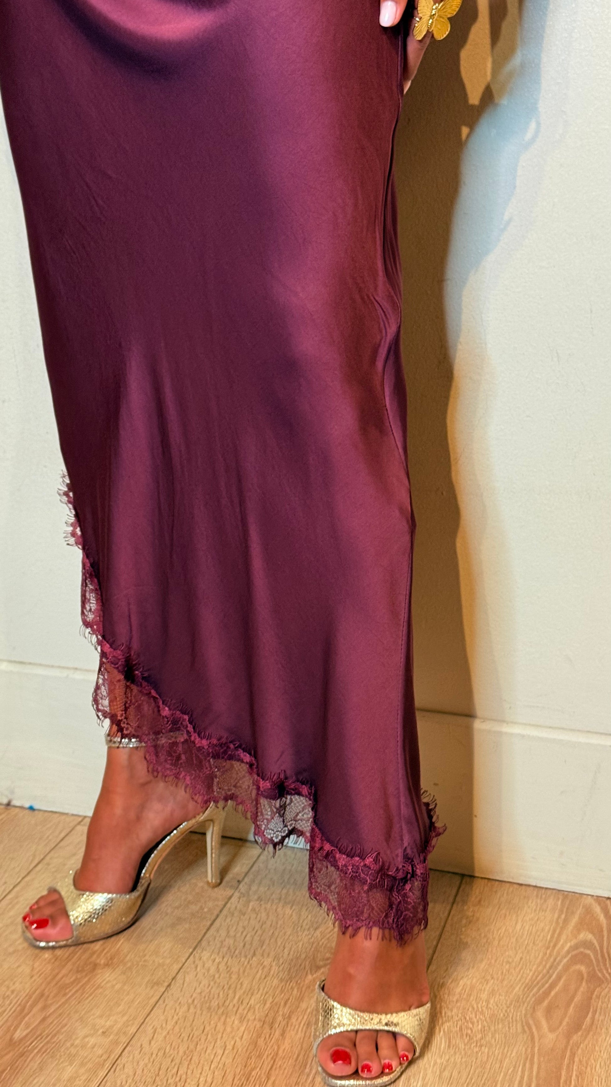 Falda le vera con detalle de puntilla en parte inferior y corte asimétrico