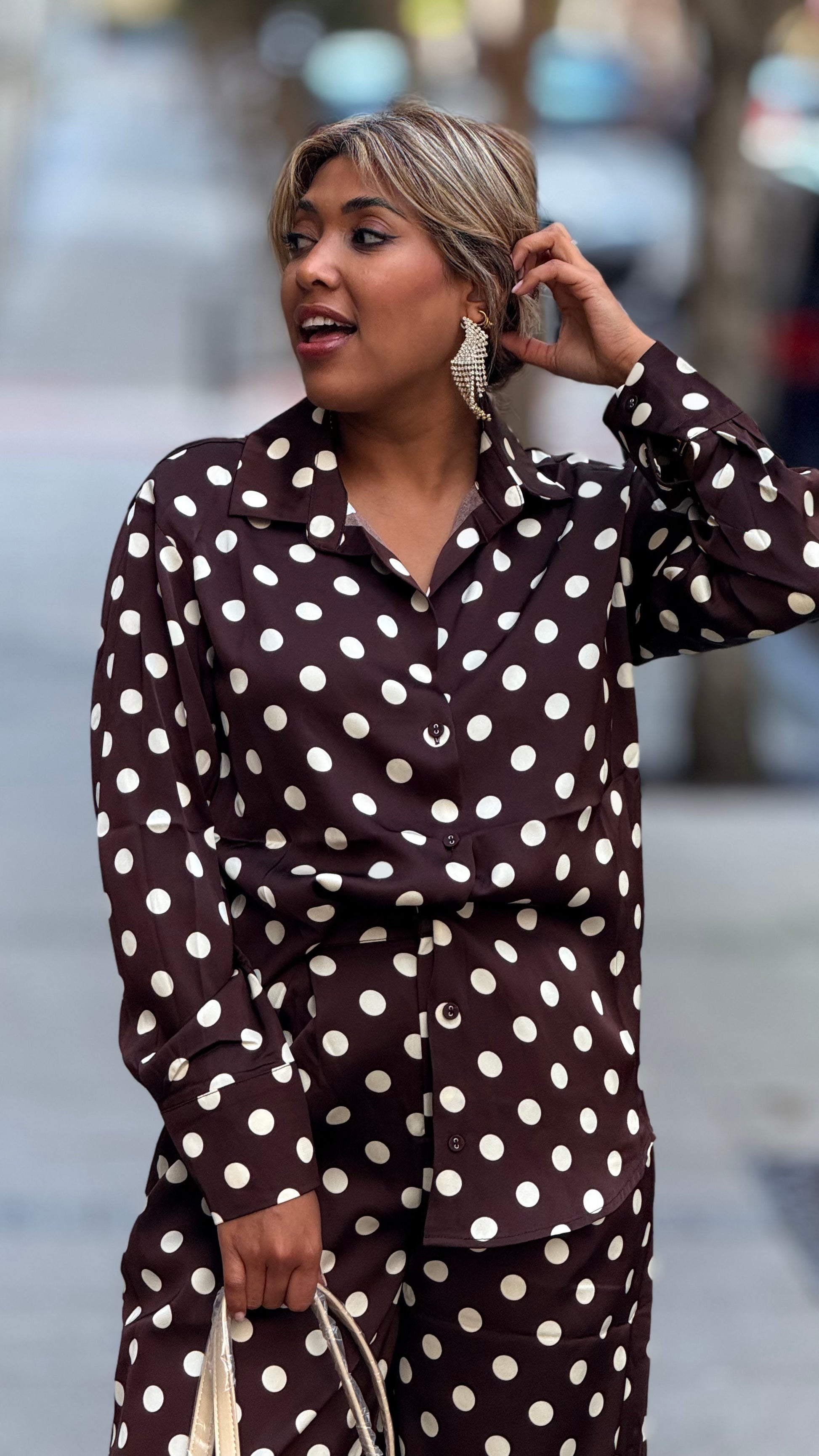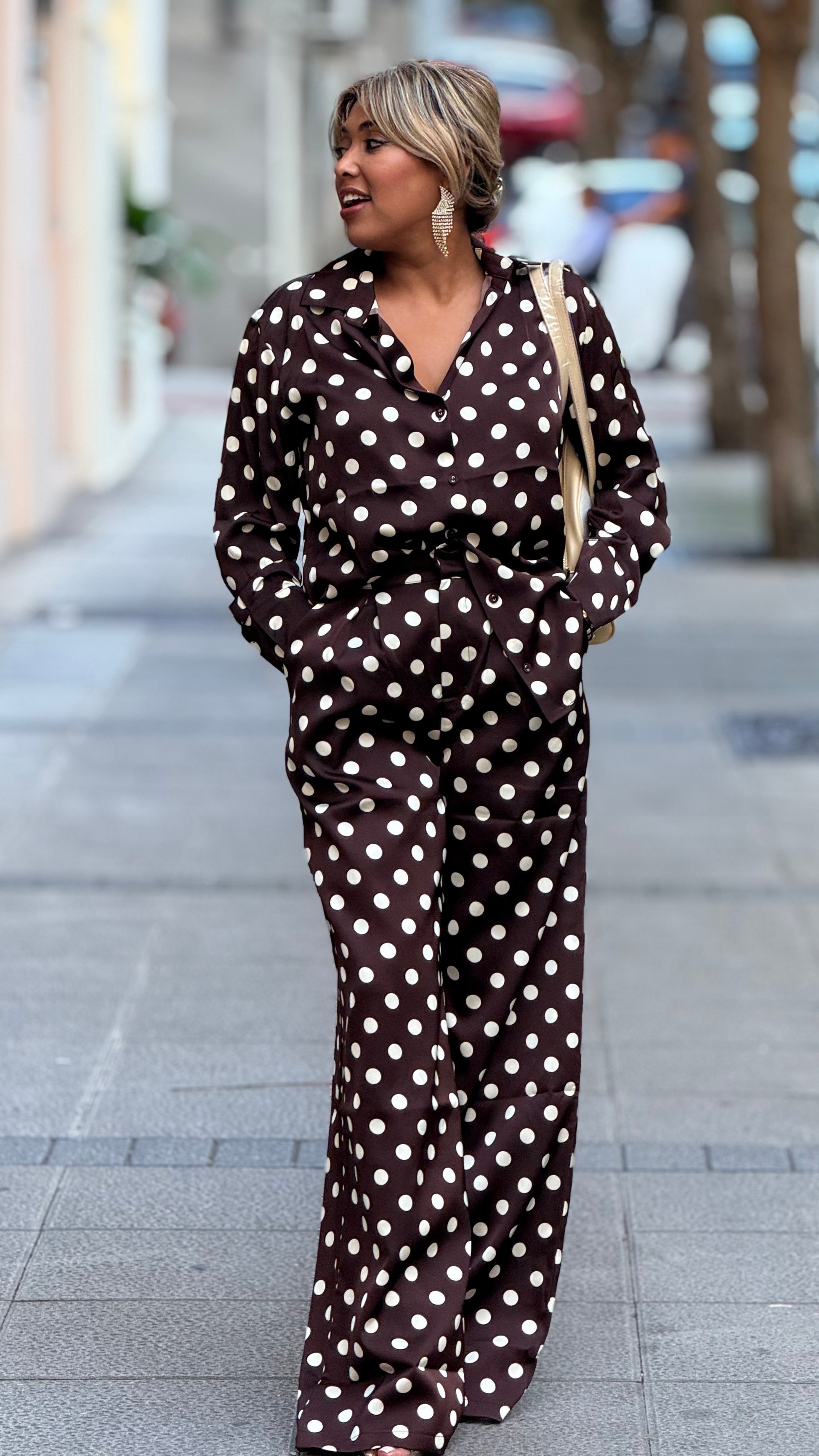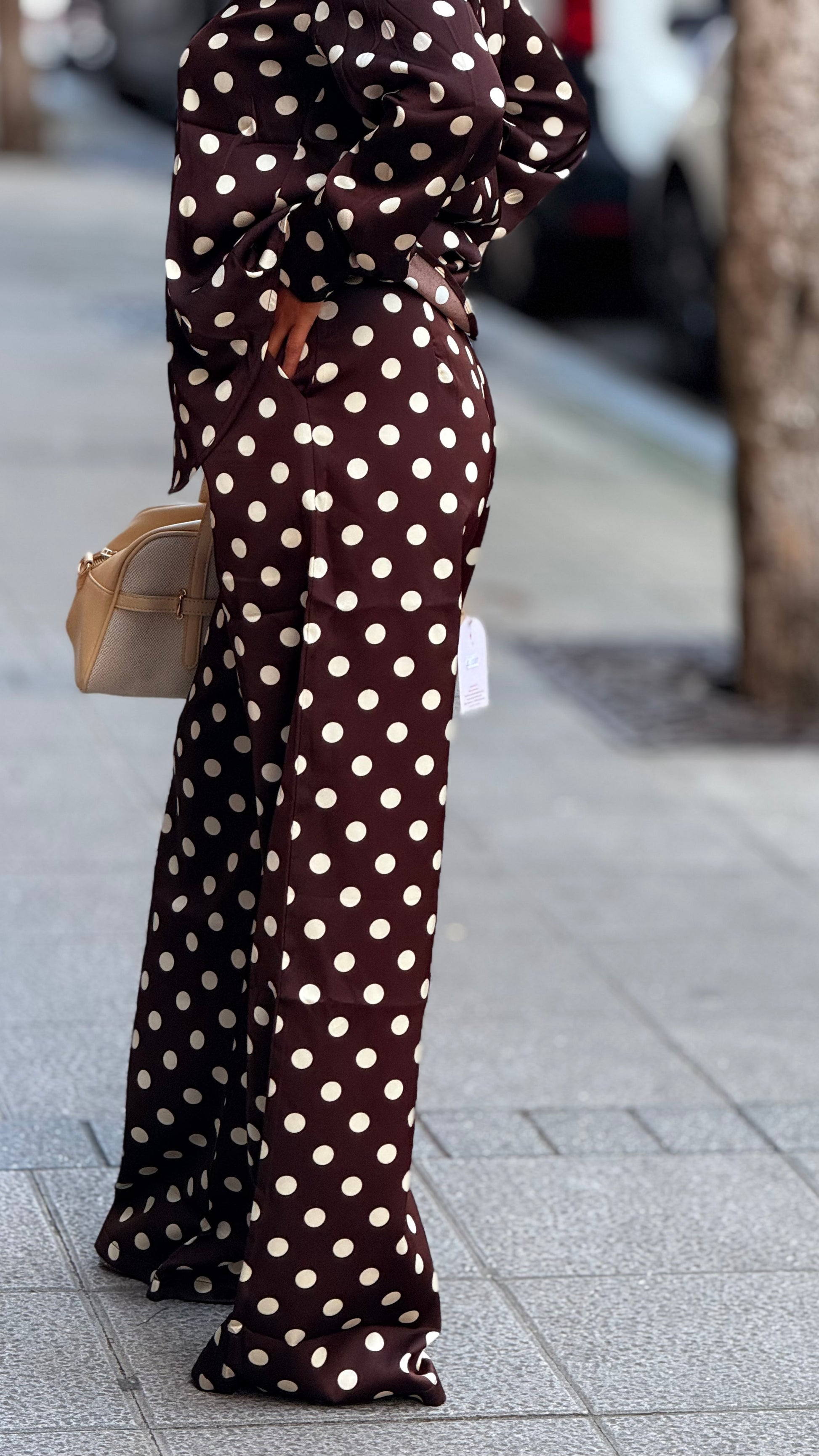 Este conjunto de blusa y pantalón de lunares en color chocolate destaca por su diseño sofisticado y atemporal. La blusa vaporosa y abotonadura frontal aporta un aire elegante y romántico, mientras que el pantalón con pernera ancha y fluido realza la silueta y aporta dinamismo al look. Gracias a su tejido ligero y a su corte favorecedor, es ideal tanto para ocasiones especiales como para el día a día con un toque chic