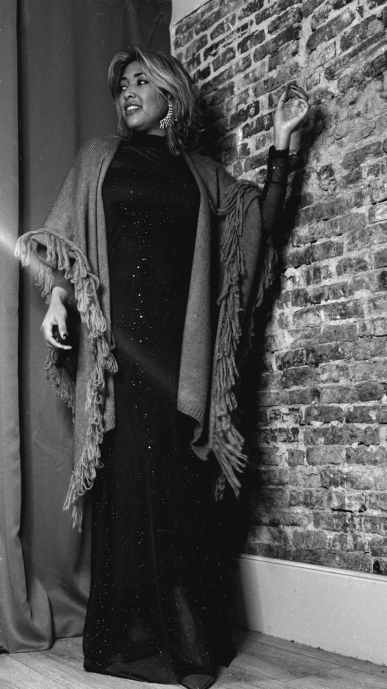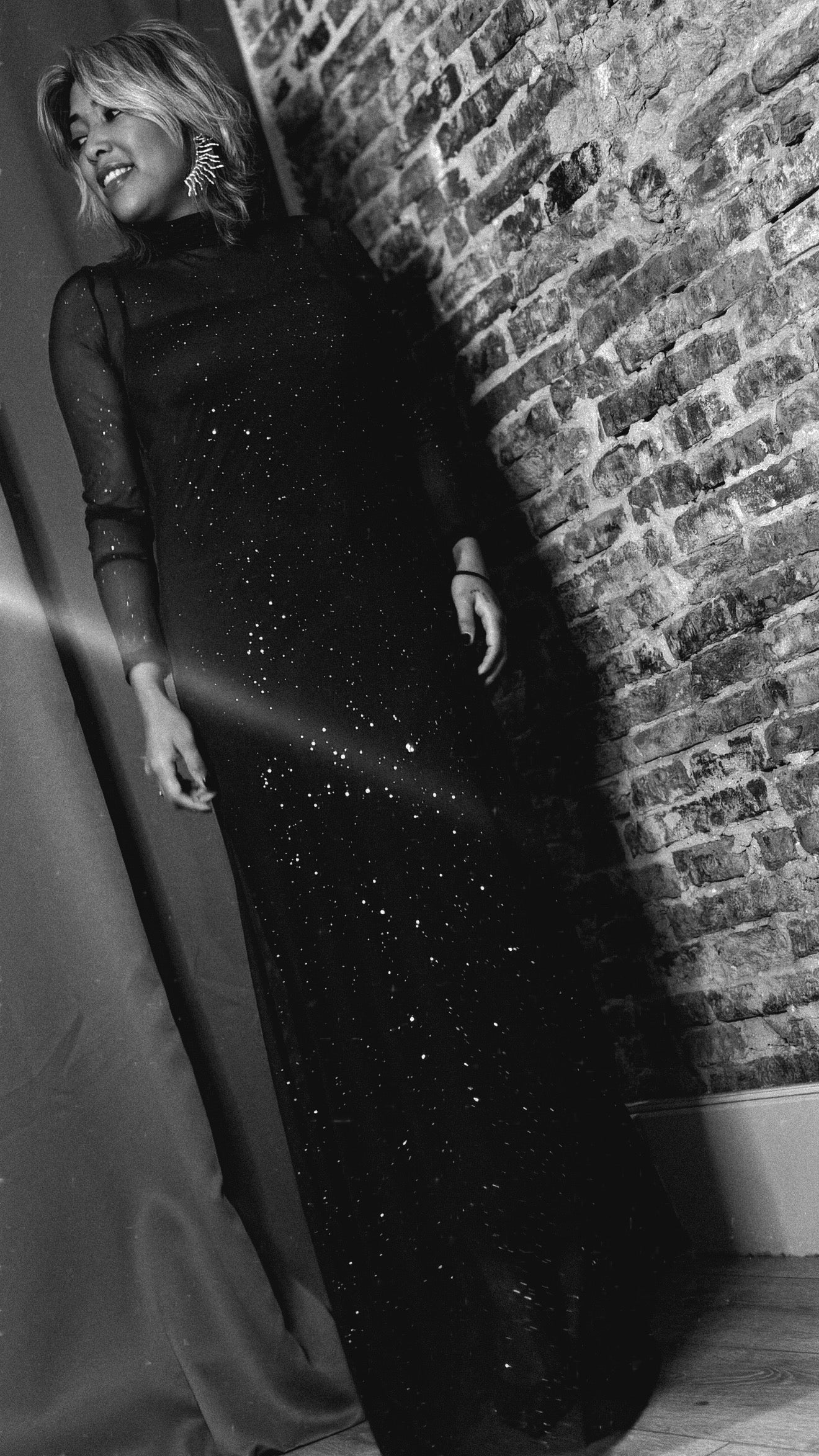 El cuerpo interior presenta un acabado con microdestellos distribuidos por toda la prenda, creando un brillo sutil ideal para eventos y ocasiones especiales.