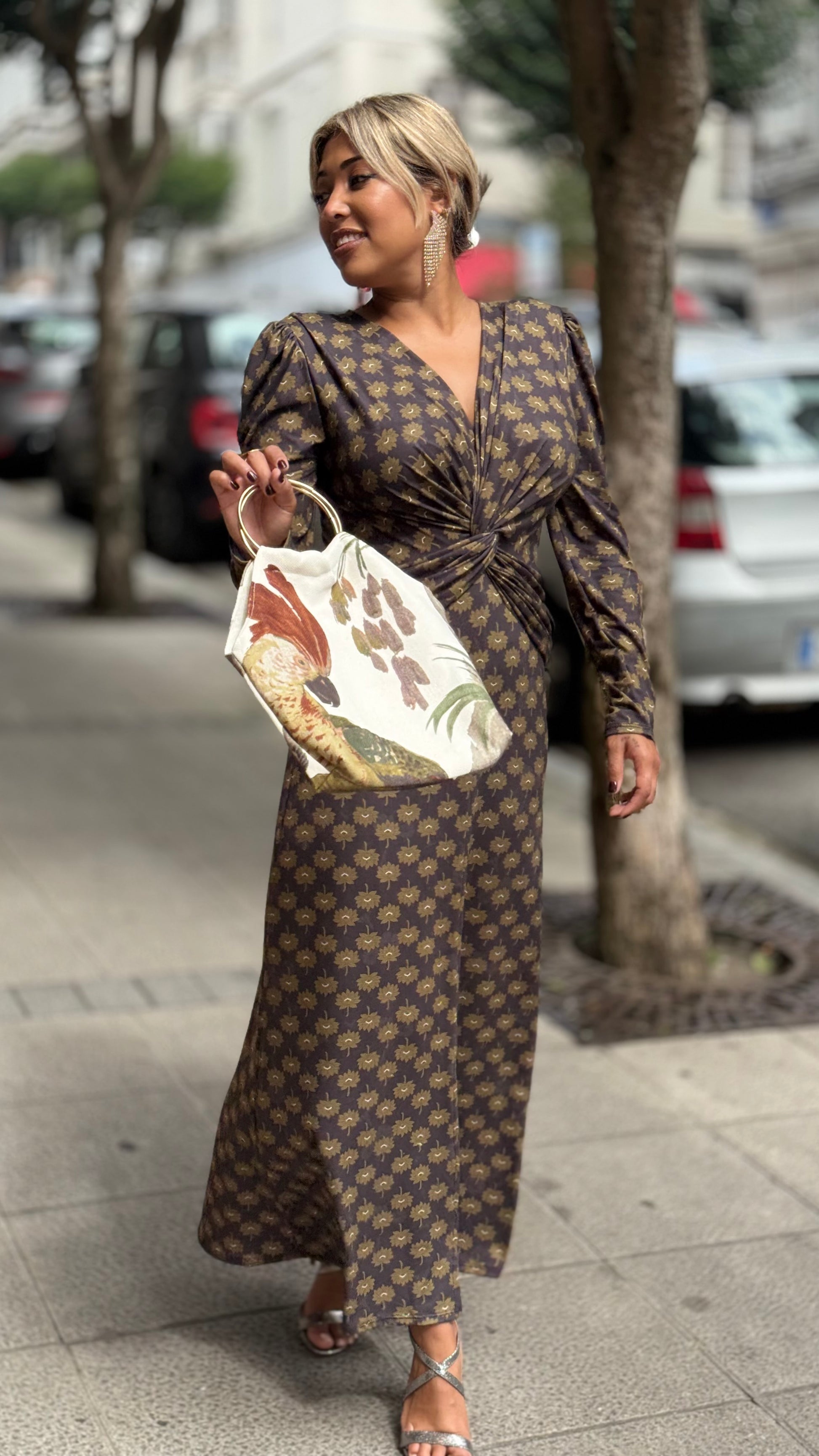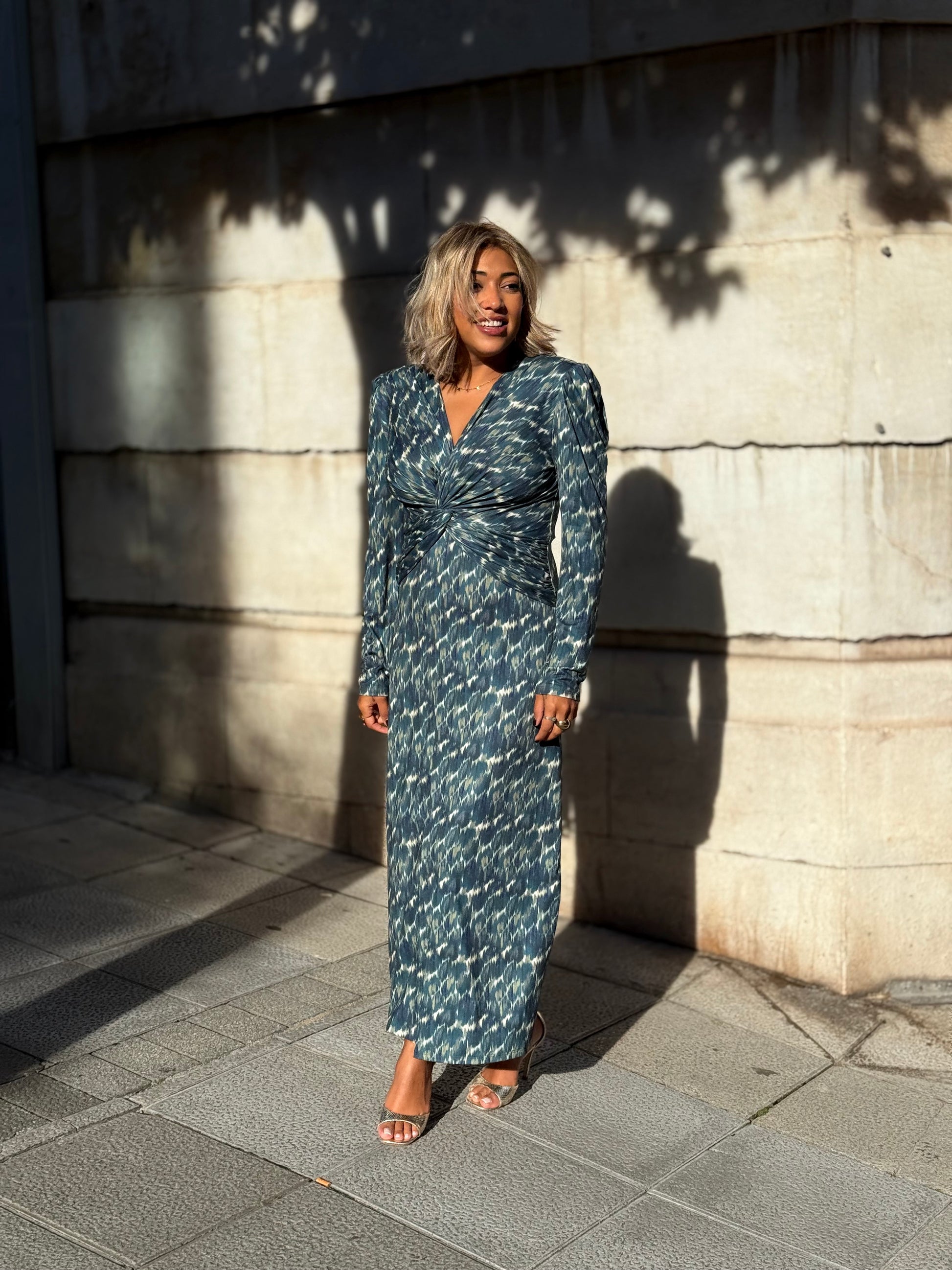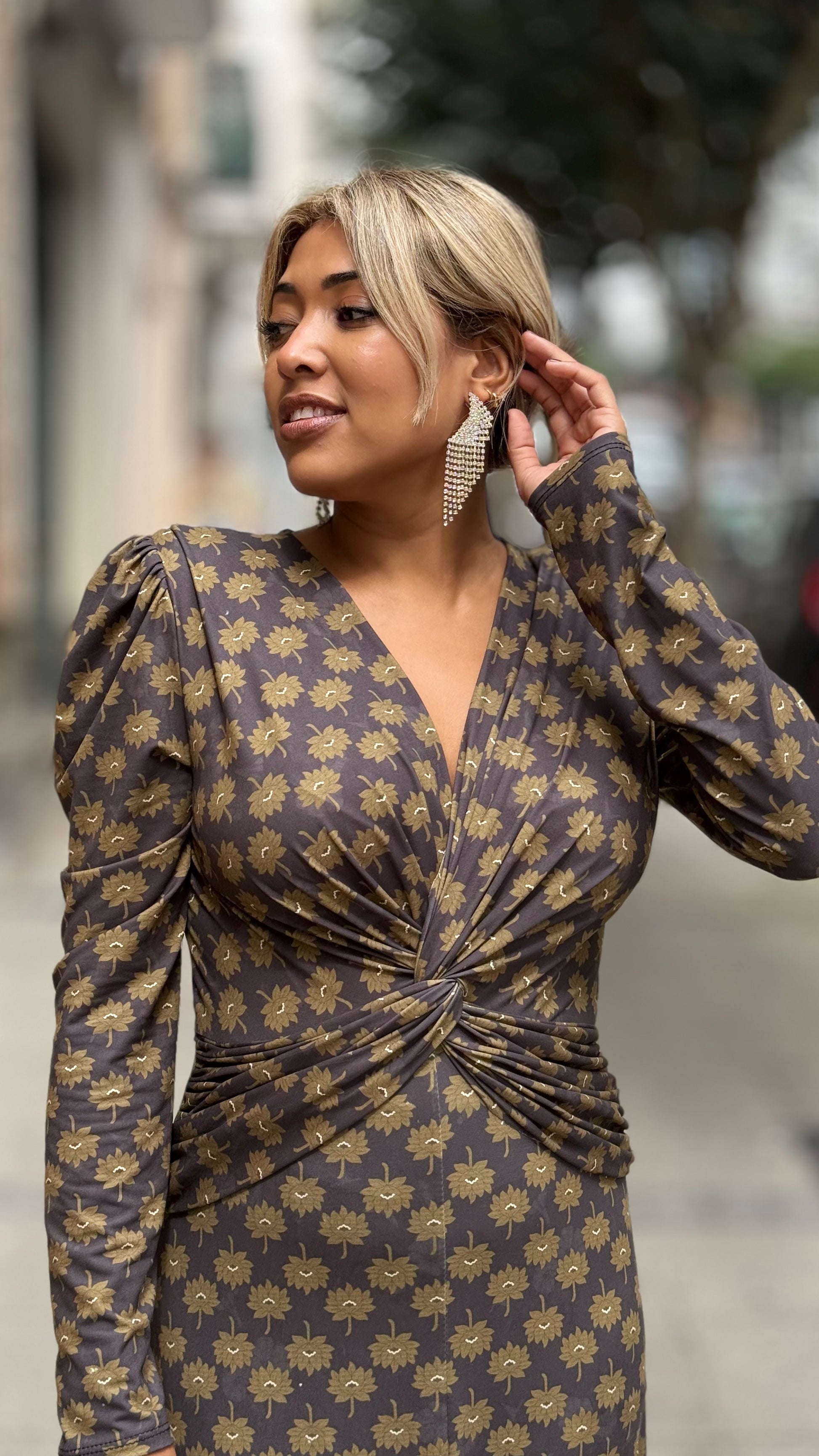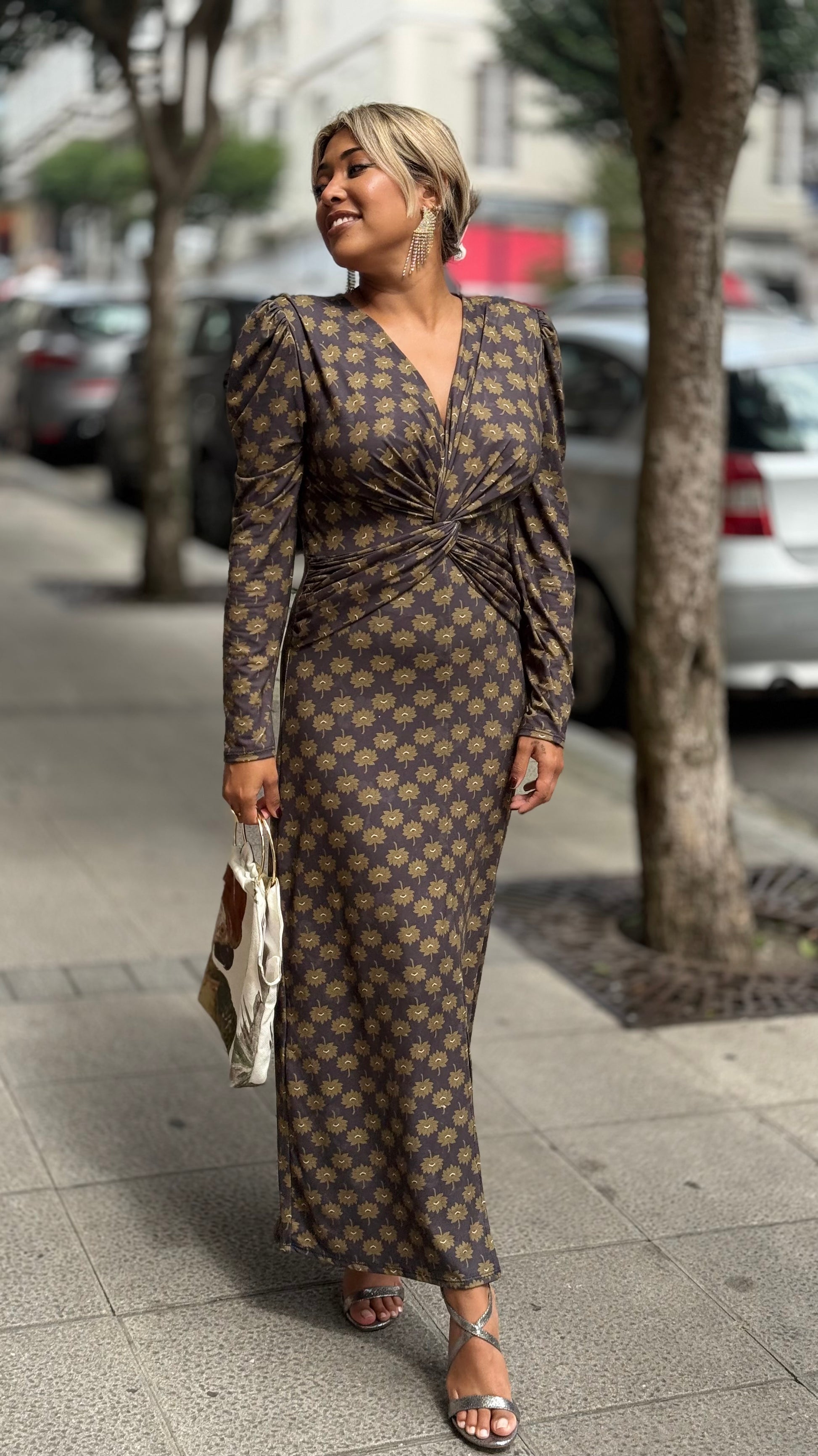 Este Vestido Elois de manga larga con escote en V y detalle de frunce te dará una apariencia elegante y sofisticada. Su tela elástica proporciona comodidad y su abertura trasera facilita el movimiento. Perfecto para cualquier ocasión, te hará lucir a la moda y sentirte cómoda al mismo tiempo.