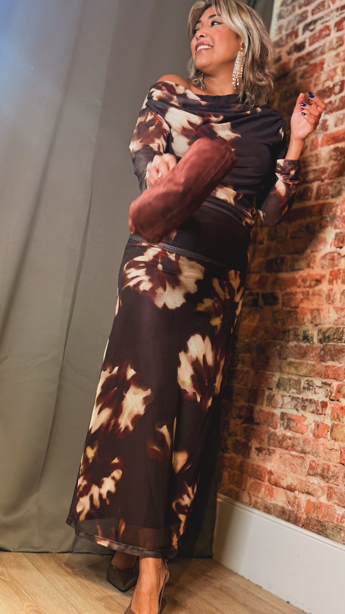 Vestido largo confeccionado en tul elástico semitransparente con forro interior. Presenta un estampado abstracto en tonos marrón chocolate, beige y caramelo, creando un efecto difuminado muy favorecedor.