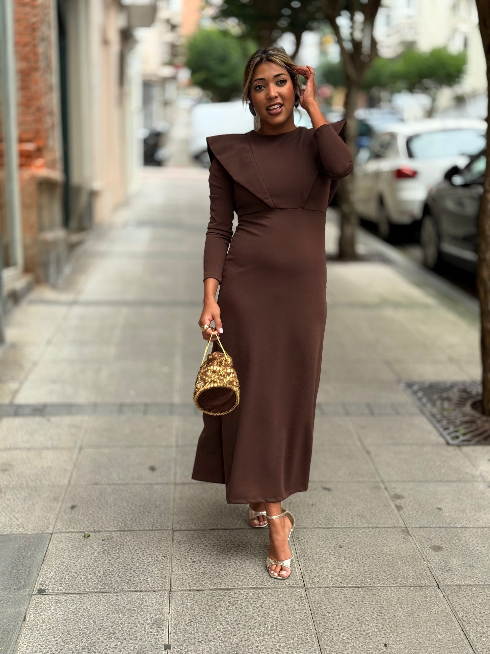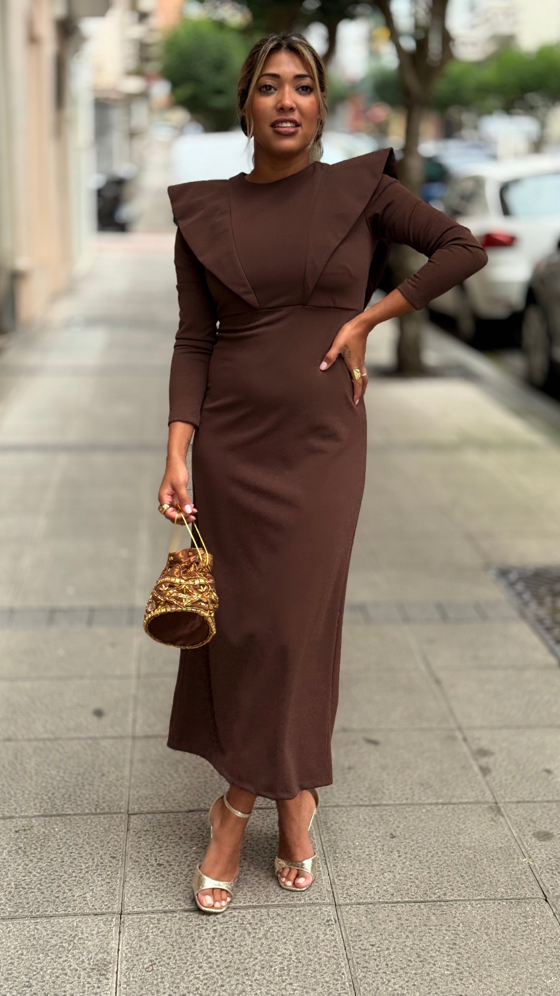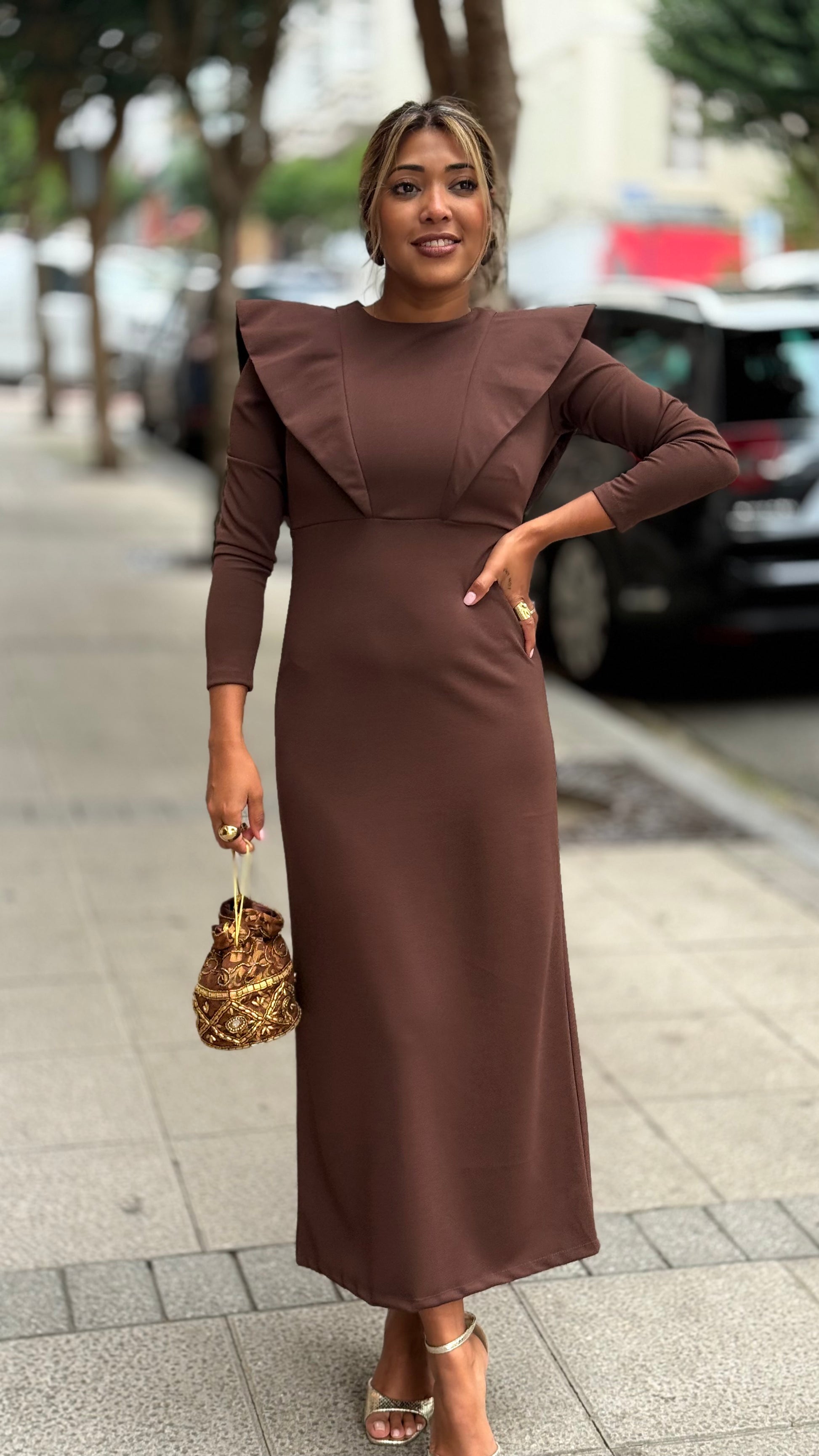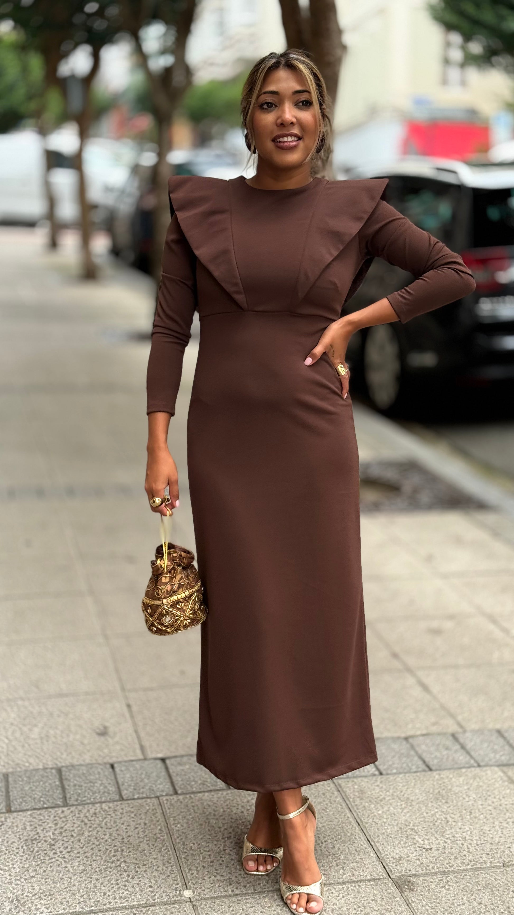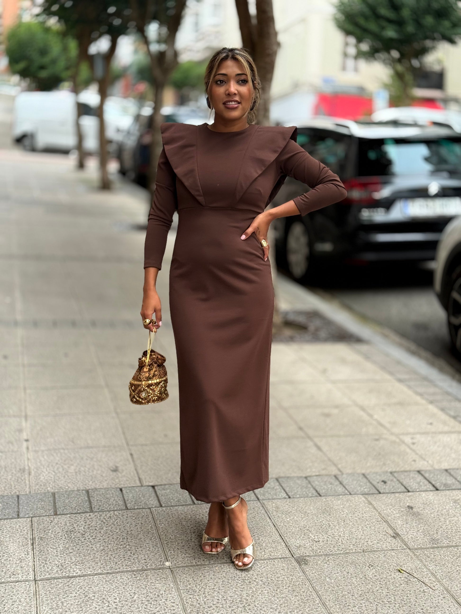 Vestido midi en color teja, maxi volantes en los hombros, cremallera invisible en la espalda y abertura trasera. Talla única
