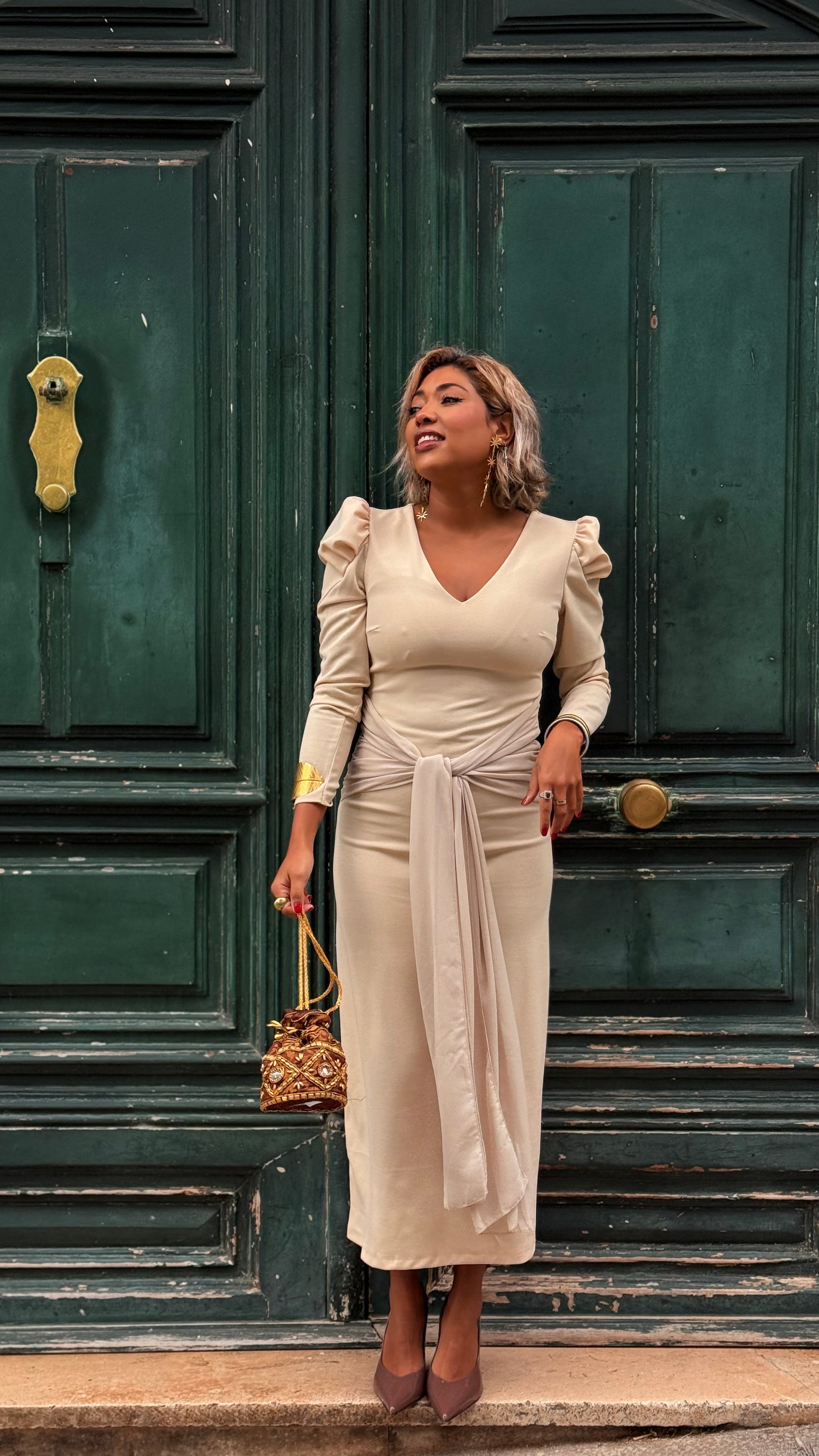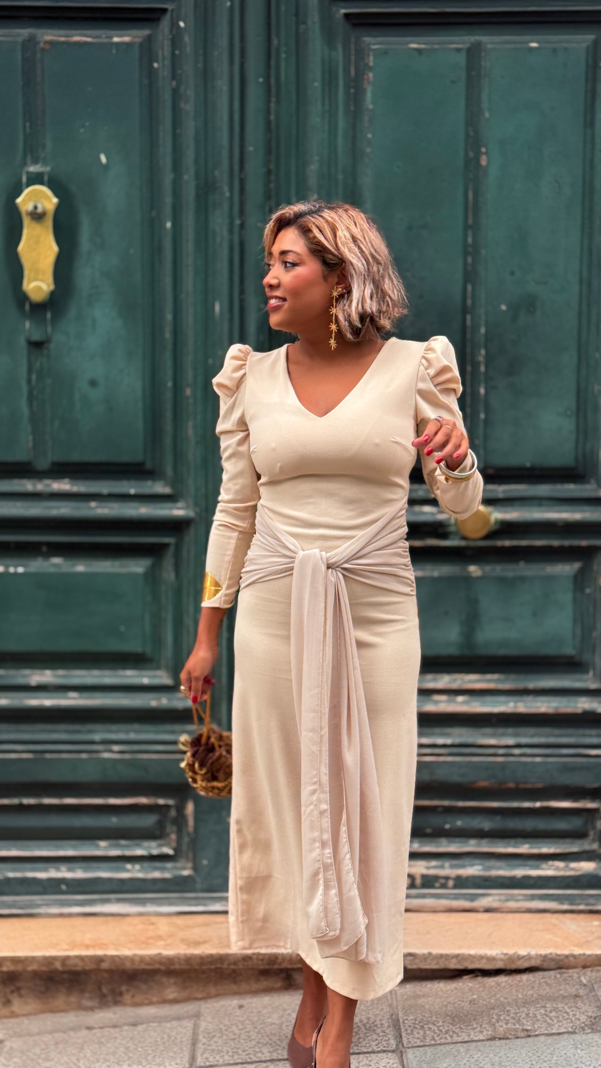 El vestido Pandora es un vestido midi de manga larga con escote en V, diseñado para adaptarse a diversas ocasiones. Sus detalles en gasa permiten múltiples estilos, ya sea con lazada frontal o trasera, ofreciendo versatilidad en la presentación. Ideal para quienes buscan elegancia y funcionalidad en una prenda.