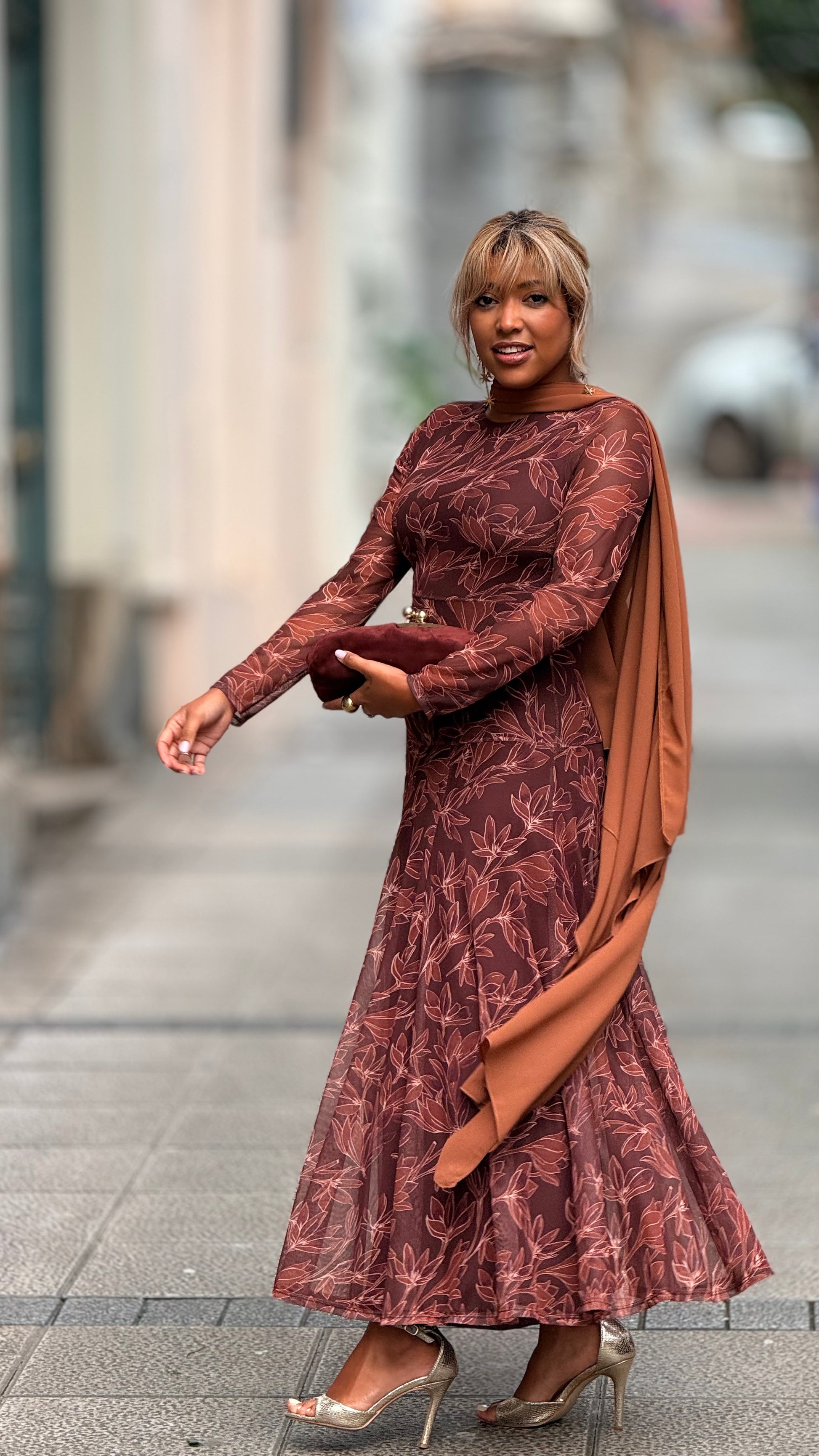 Sofisticación y calidez en una sola pieza. Este vestido midi en tono teja destaca por su delicado estampado floral en líneas suaves que aporta profundidad y movimiento al diseño.